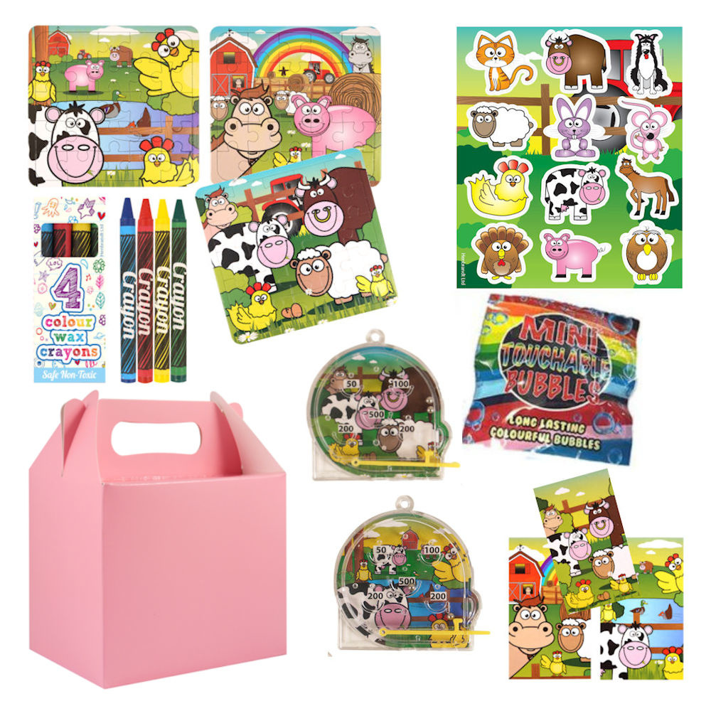 Henbrandt 10 STUKS | LUXE BOERDERIJ Traktatie ROSE Doos INCLUSIEF Uitdeel Kado's. Bestaande uit: Uitdeelbox, Krijtjes, Notitieblok, Flipperspel, Puzzel, Stickervel en Bellenblaas | Jongens & Meisjes | Tractatiedozen voor Verjaardagen en Kinderfeestjes