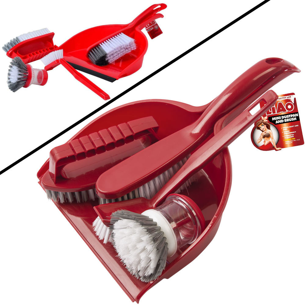 Deze set bestaat uit: een rode Plastic Stoffer en Blik, Afwasborstel, Hand Borstel en en ronde Reinigingsborstel.