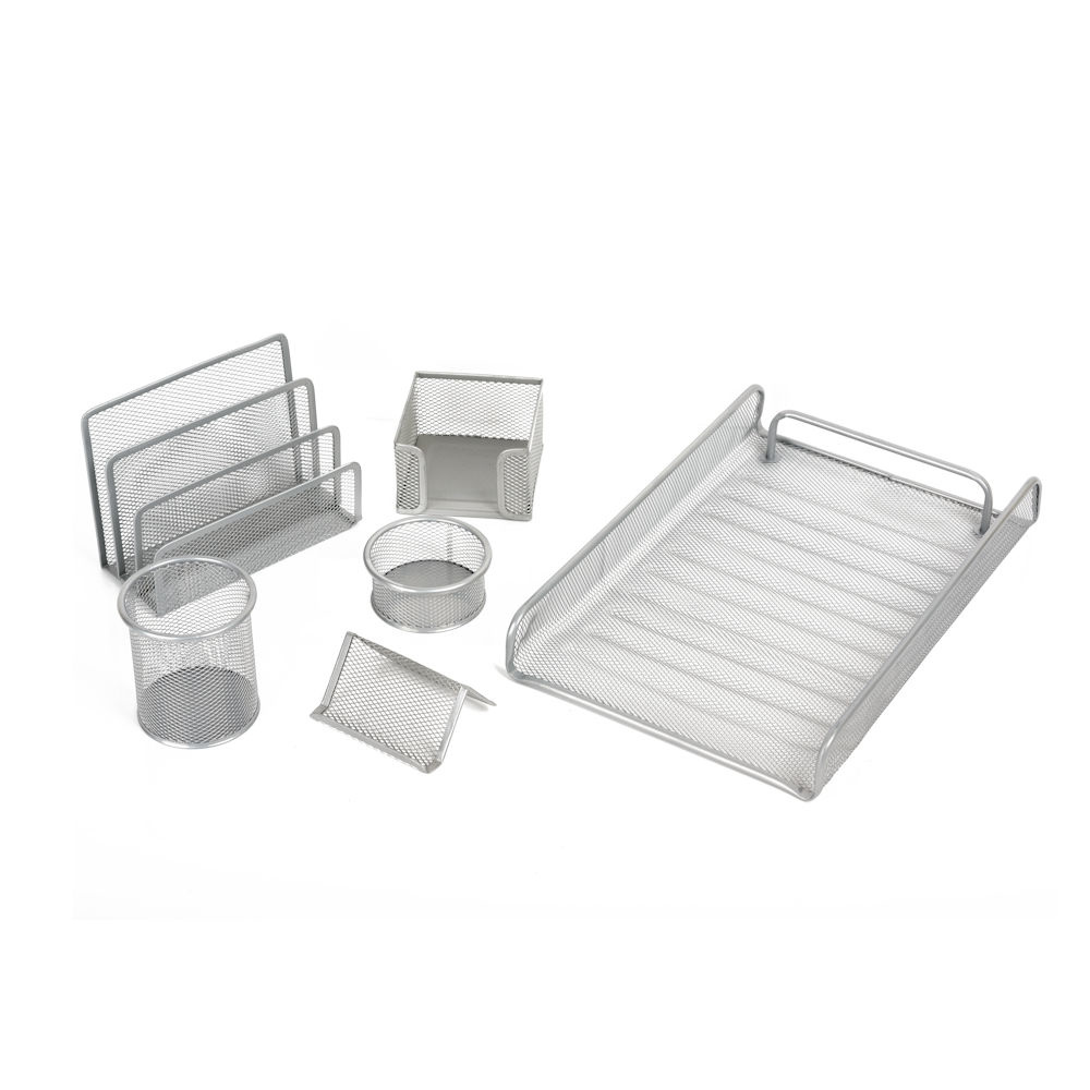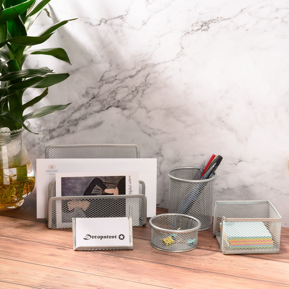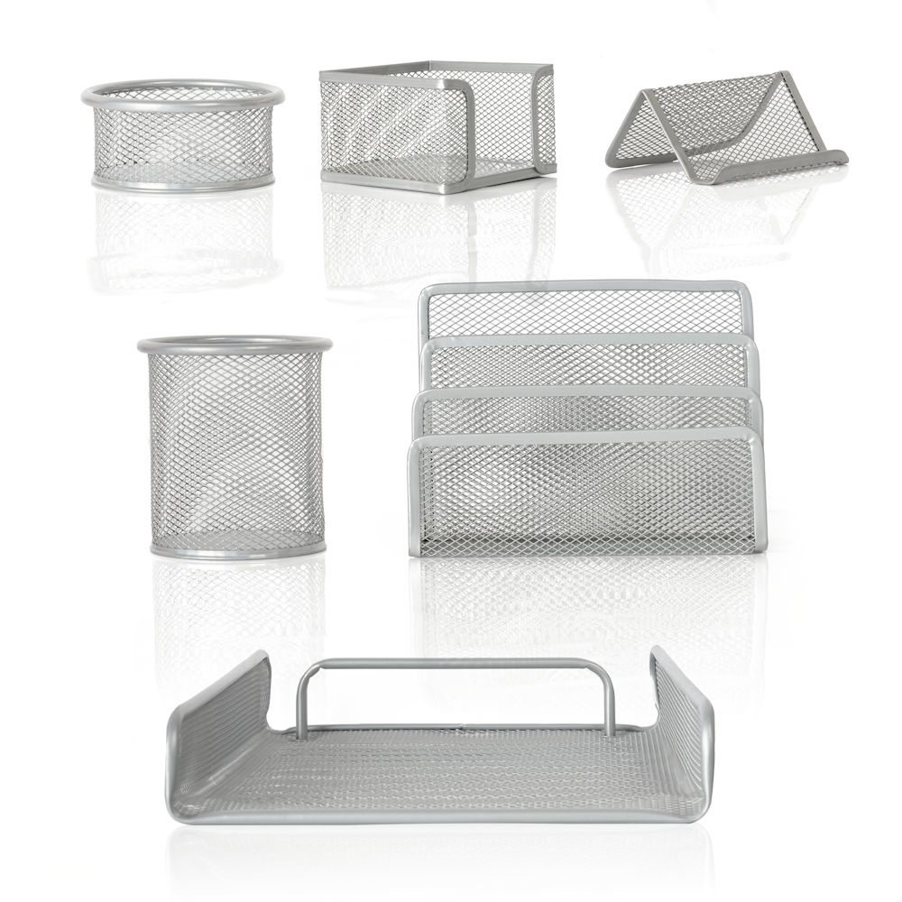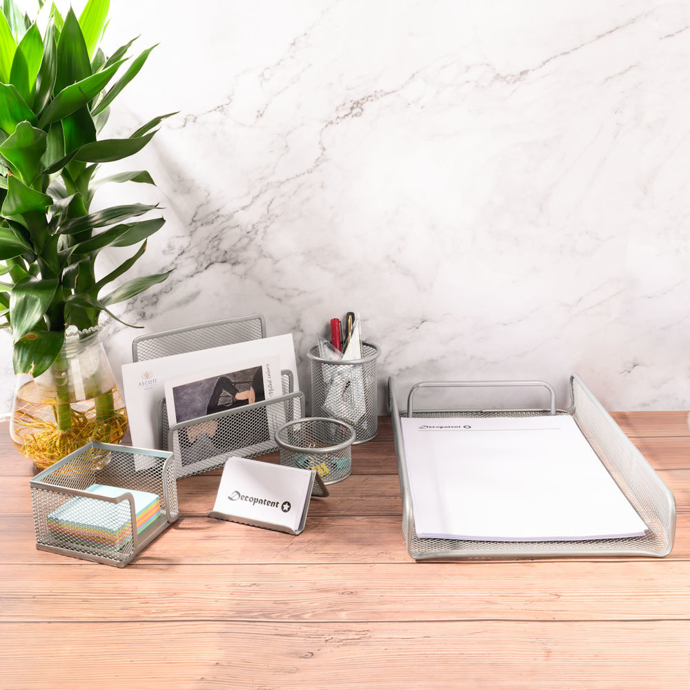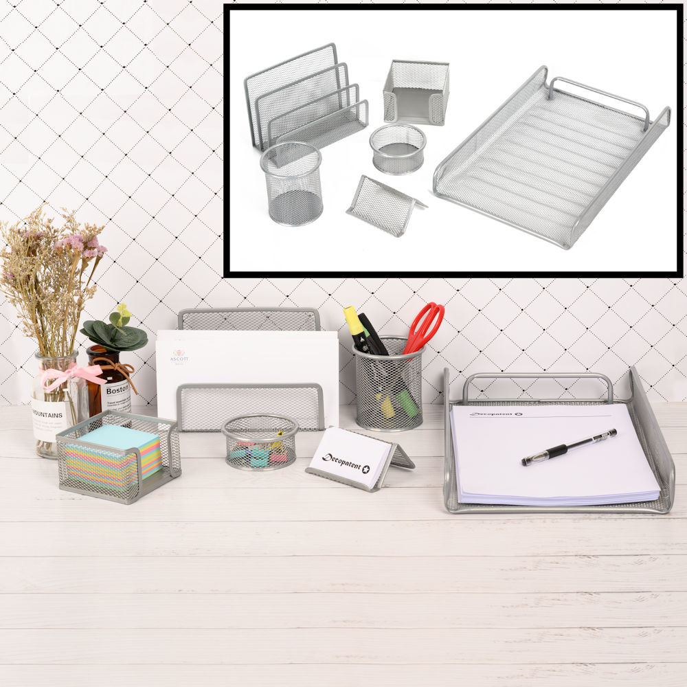 Decopatent 6 Delige Complete Bureau Organizer Set - Mesh bureau organizer - Pennenbakje van metaal / gaas - Brievenbak - Memobox - Paperclip houder - Visitekaartjes houder - Brief houder - Buro pennenhouder - Kleur: Zilver – Decopatent®