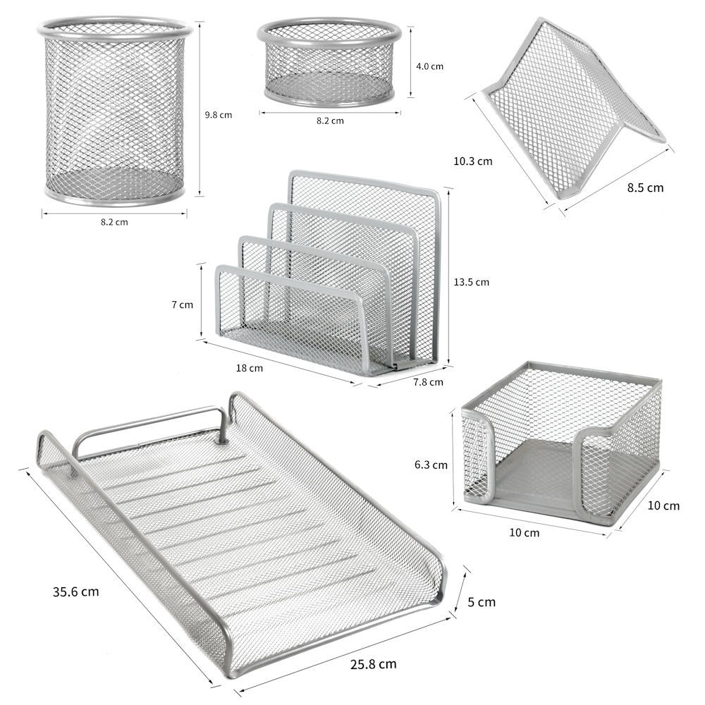 Door de professionele kwaliteit is deze complete bureau organizer set geschikt voor thuisgebruik en voor gebruik op kantoor of in een kinderkamer of tienerkamer. Omdat hij gemaakt is van zilver / grijs metaal heeft hij een sfeervolle look en past hij in elke interieur.