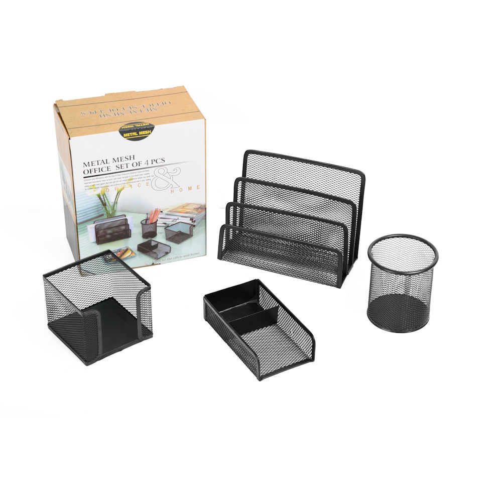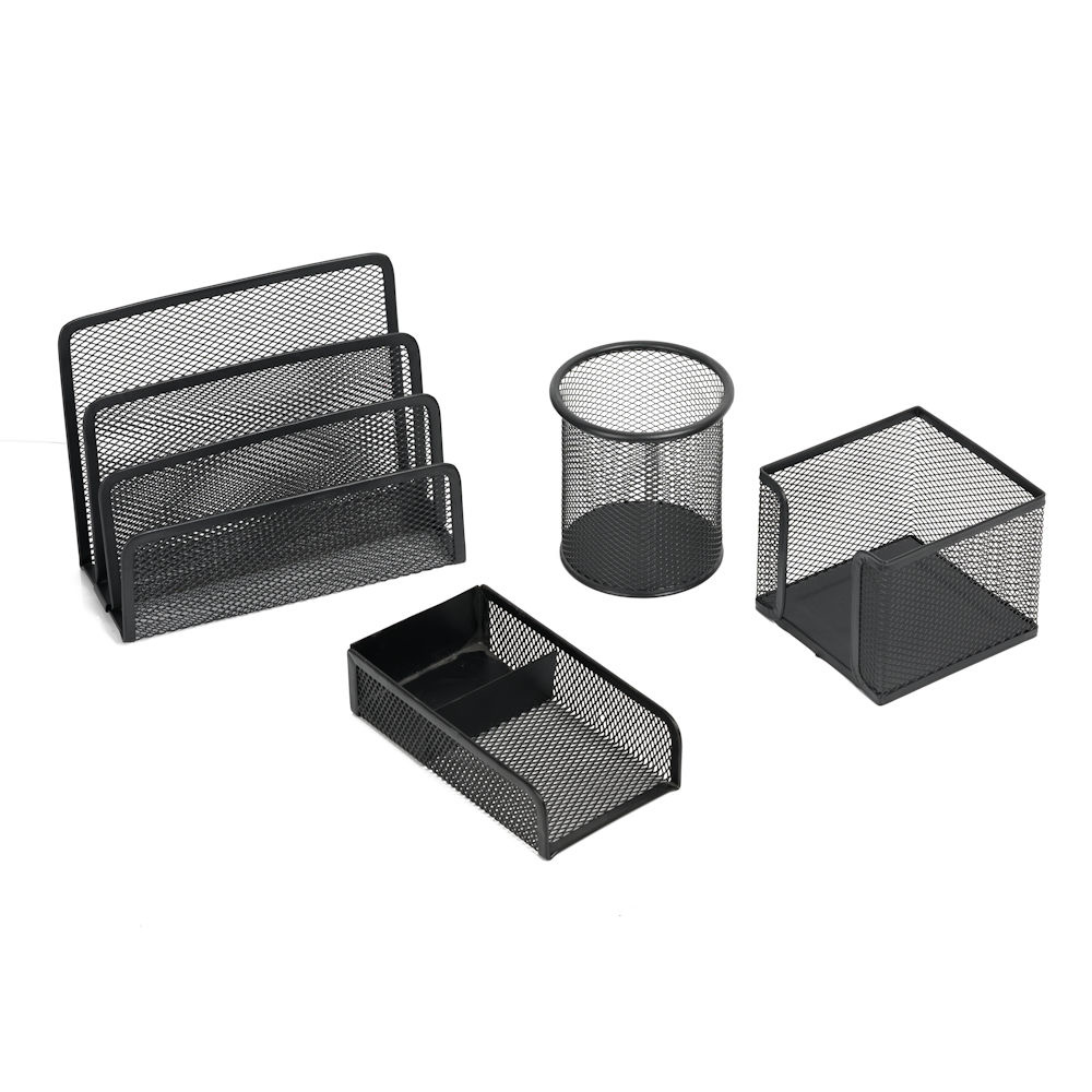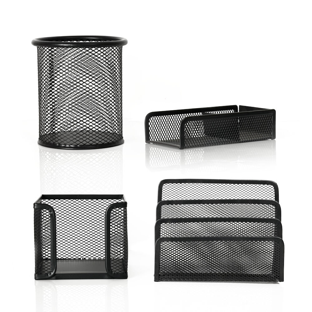 Decopatent 4 Delige Complete Bureau Organizer Set - Mesh bureau organizer - Pennenbakje van metaal / gaas - Brievenbak - Memobox - Paperclip houder - Brief houder - Buro pennenhouder - Kleur: Zwart – Decopatent®