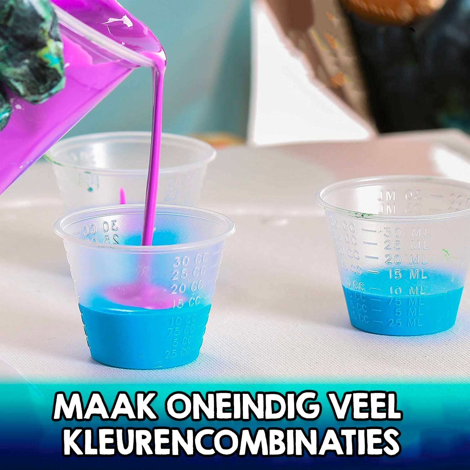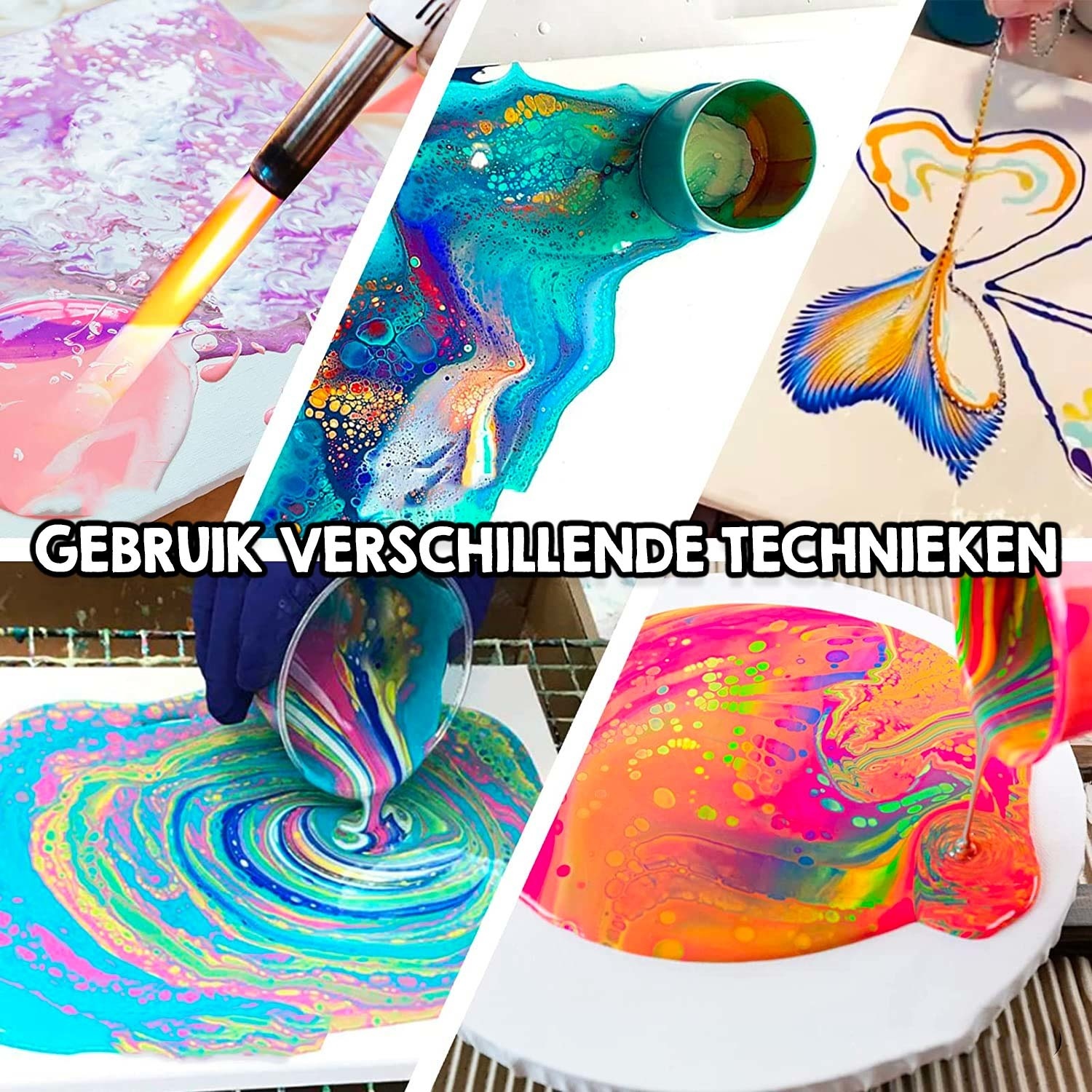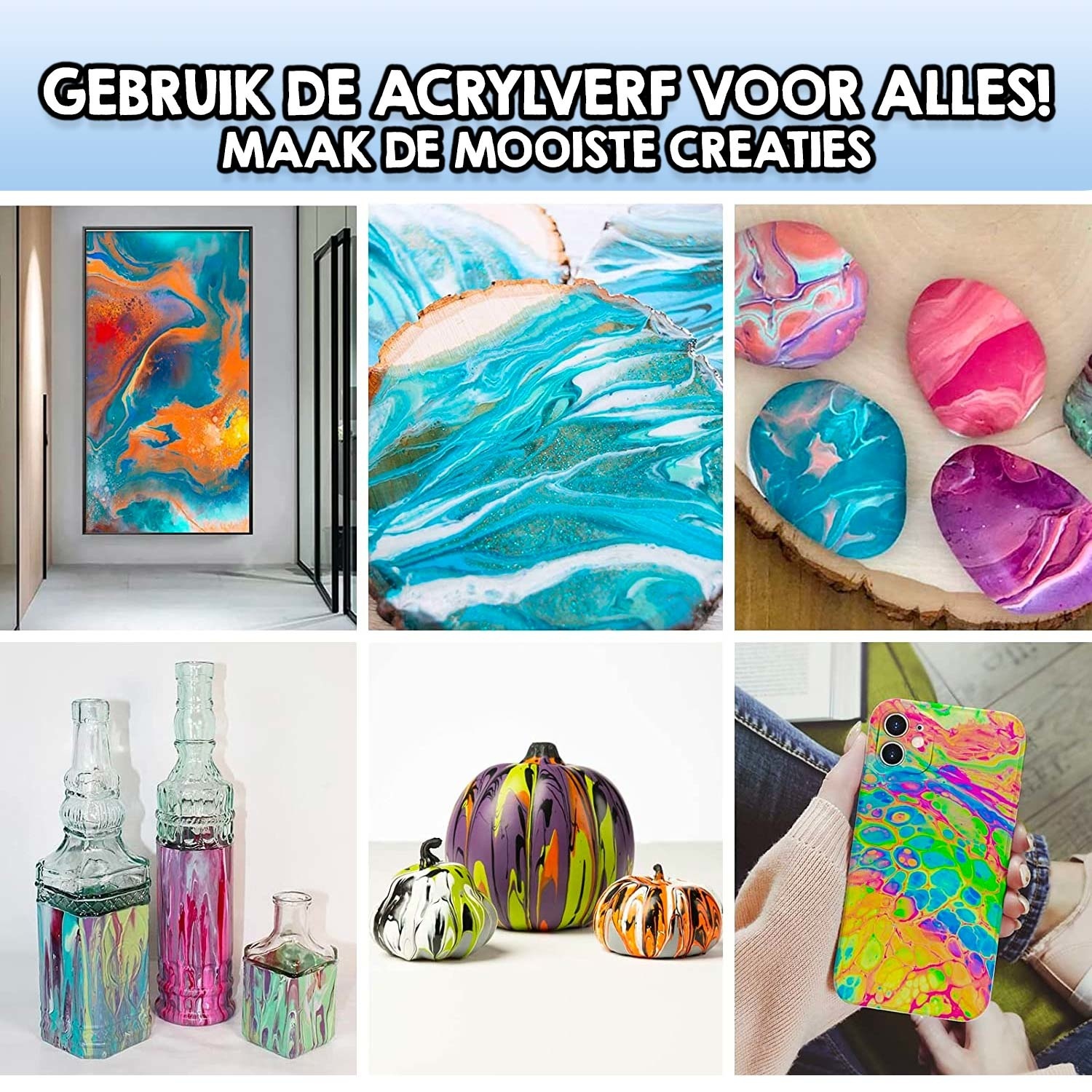 Met acryl pouring maak jij de mooiste gekleurde knutselprojecten! Giet de felle kleuren verf en krijg een uniek design. In deze set zitten maar liefst 8 verschillende kleuren, zodat jij kunt maken wat je wilt! Super vloeibare acryl verf voor het beste resultaat, laat je verbazen!