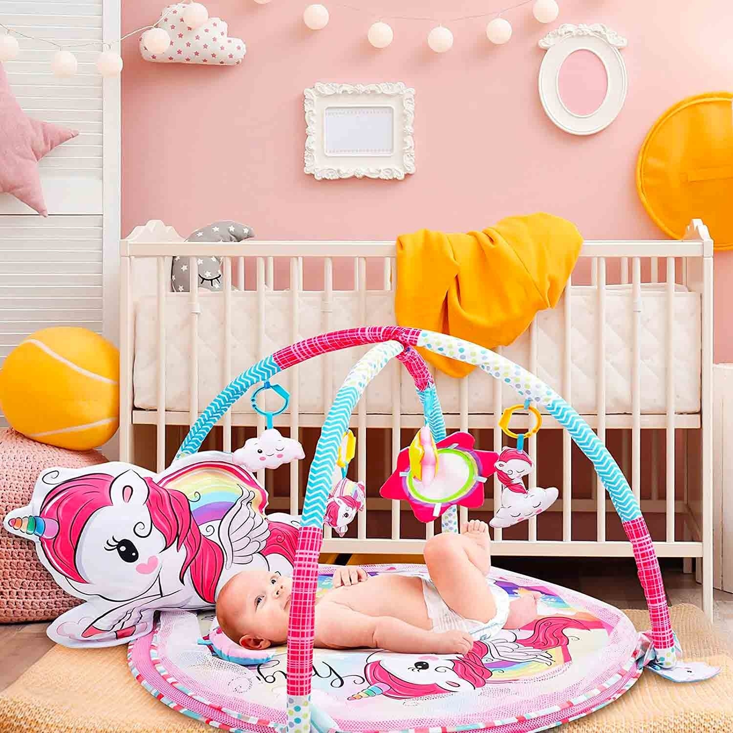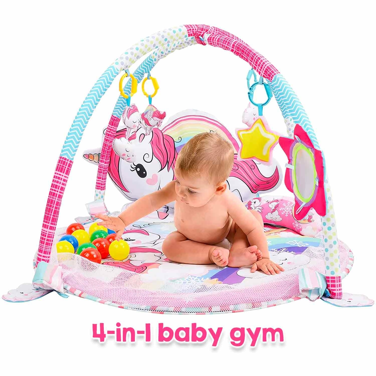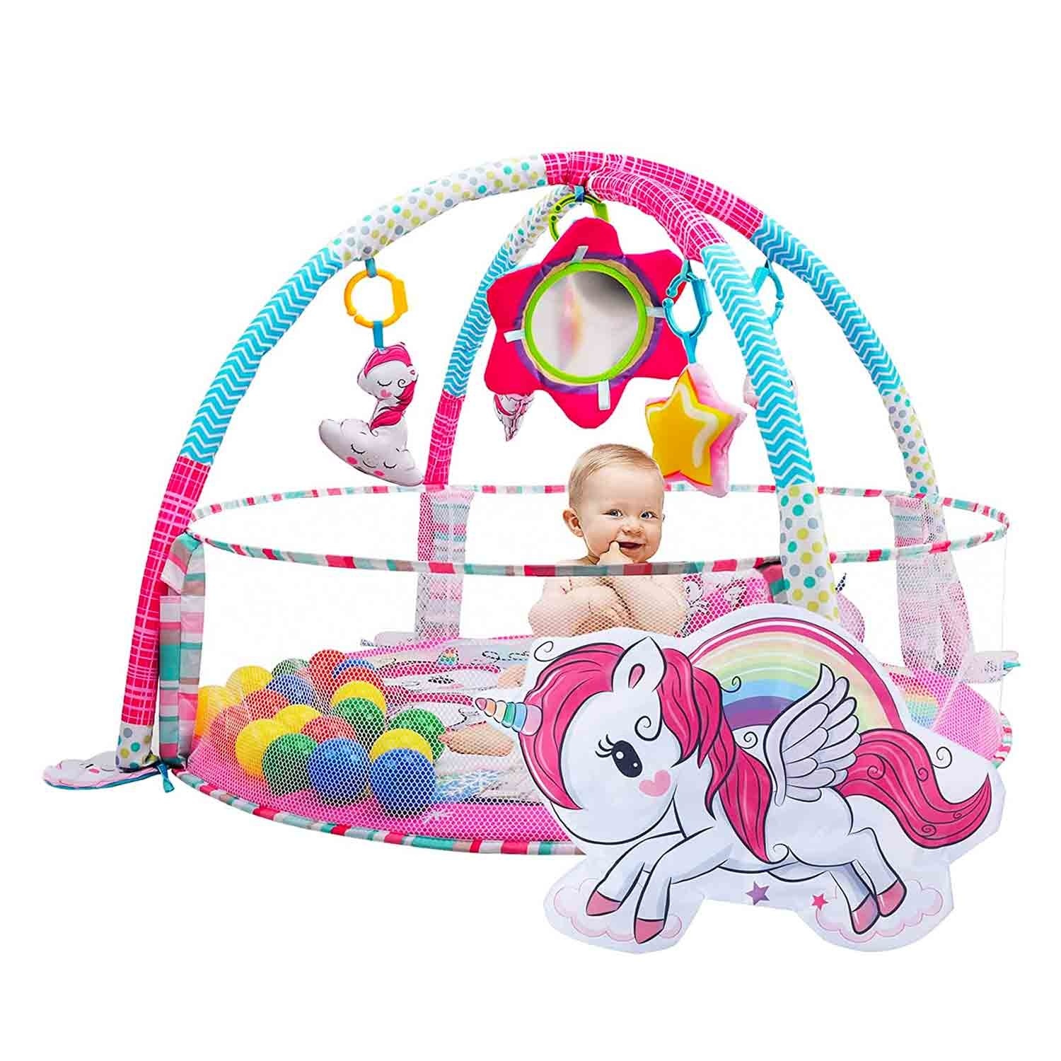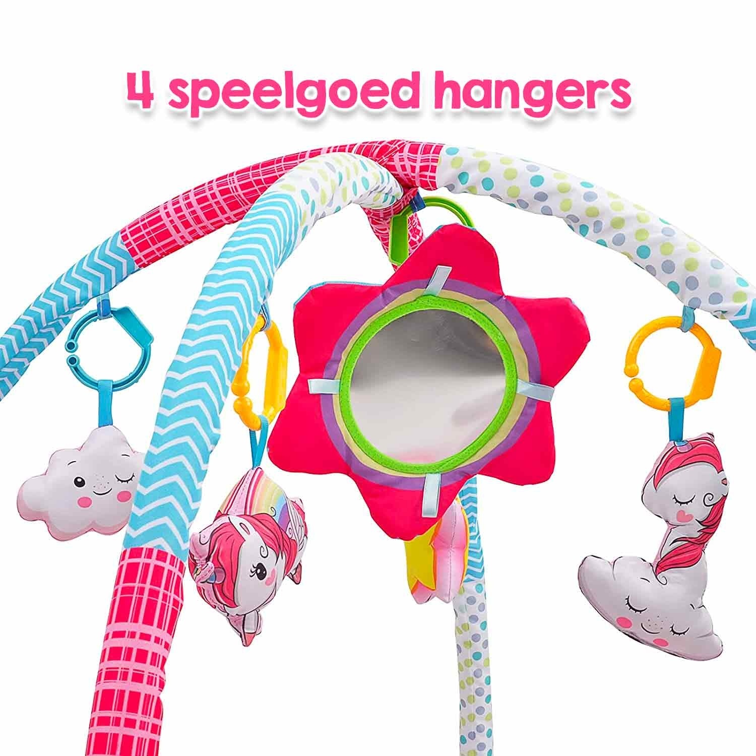 De grootste en meest uitgebreide baby gym in ons assortiment! Met 4 verschillende speelvormen, grote ballenbak en super kleurrijk in thema Unicorns. Dit activity center heeft maar liefst 4 mooie hangers en daagt jouw baby uit zich te ontwikkelen. Inclusief lekker zachte speelmat en opstaande randen, zodat alle ballen en speelgoed bij elkaar blijven. Het perfecte cadeau voor iedereen met jonge kinderen!