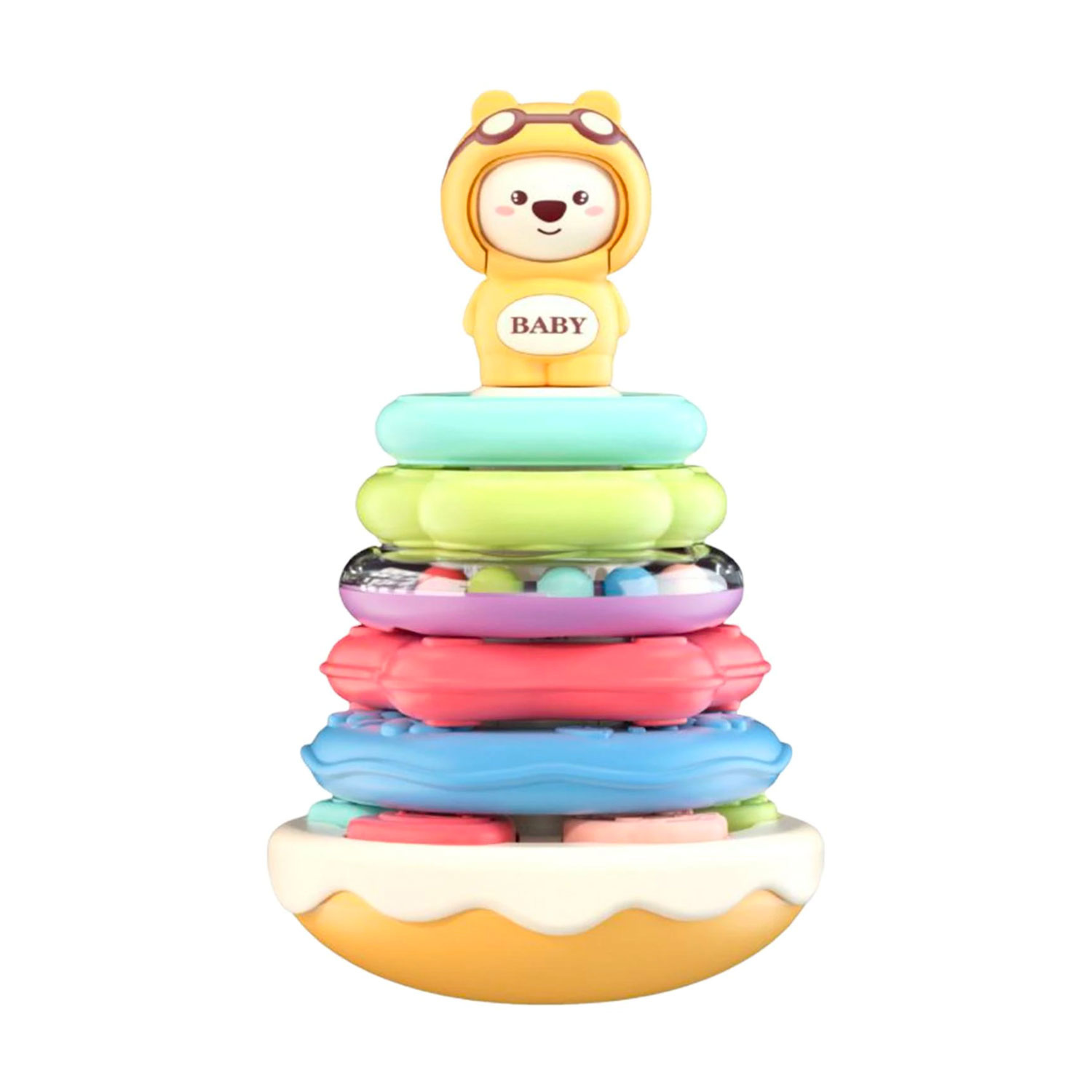 Het ideale leerzame speelgoed voor jonge kinderen. Stapel de zachte blokken op elkaar, maar pas op dat de toren niet omvalt! Leer spelenderwijs verschillende kleuren en vormen herkennen, en bouw mooie torens. Met geluid en een super schattige mascotte. Leuk als kraamcadeau!