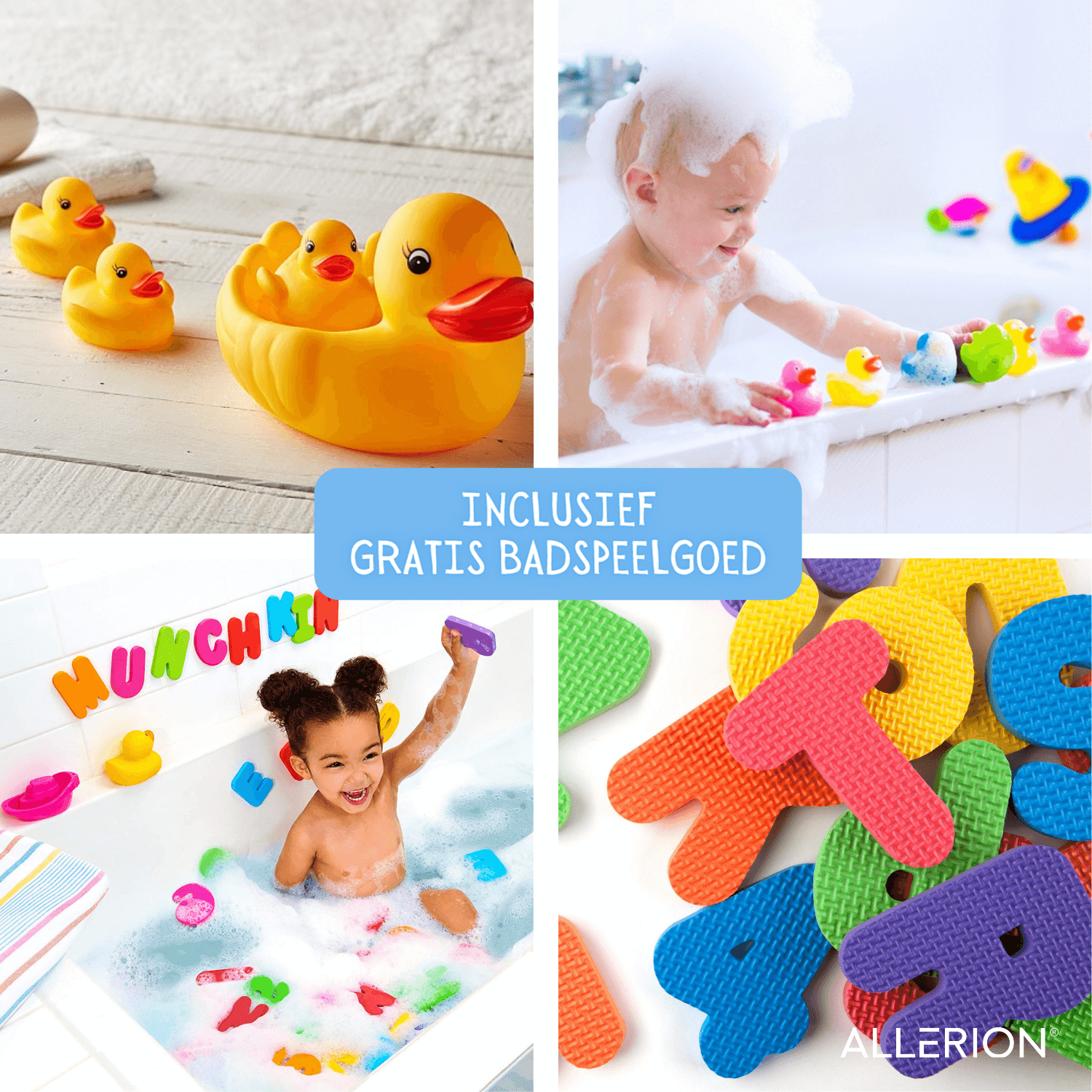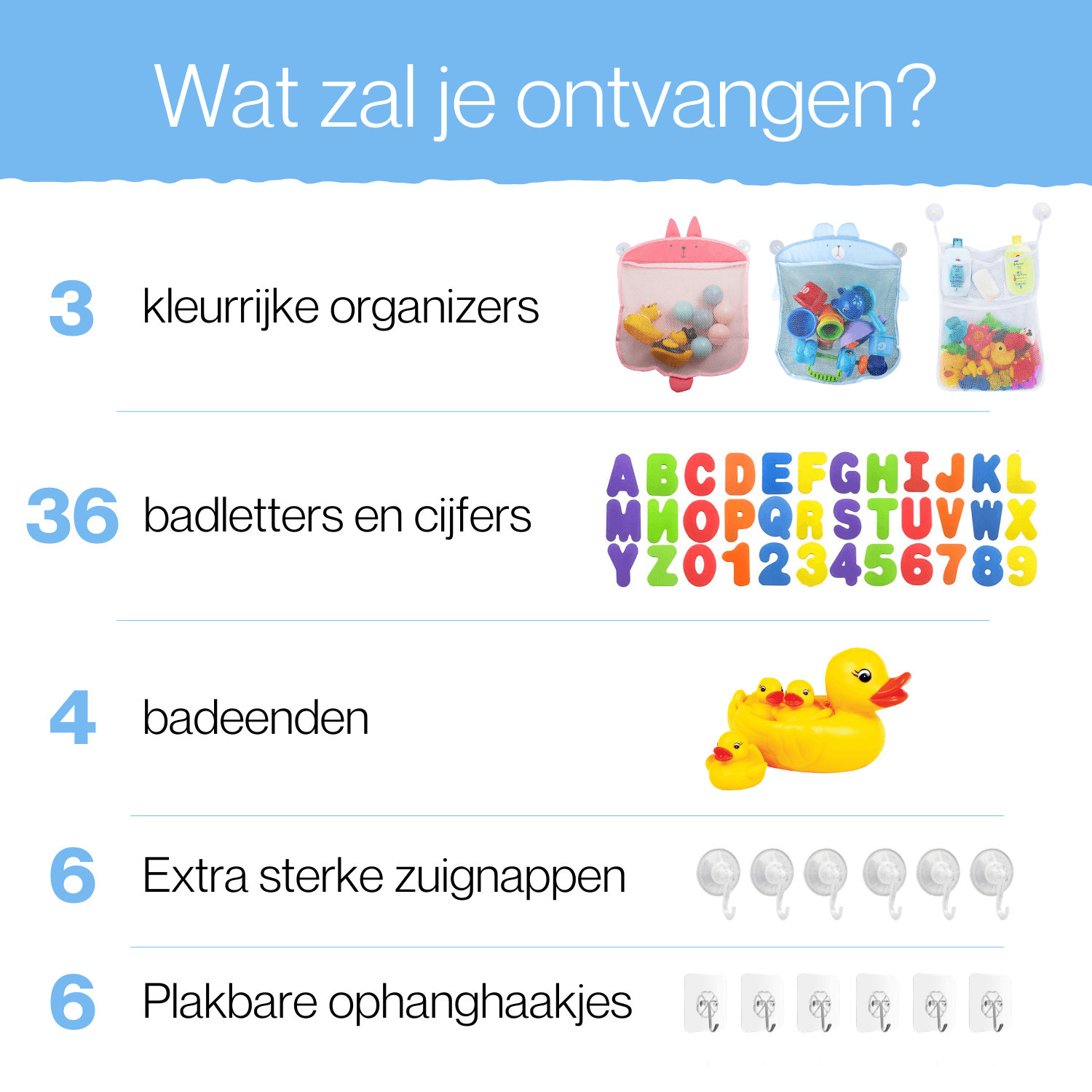 Een super complete speelgoed set voor in bad! Leer spelenderwijs kennis maken met letters en cijfers, en heb uren speelplezier met de extra badeendjes. Inclusief handige organizers, haakjes en zuignapjes om al het speelgoed bij elkaar te houden. De meest complete bad speelgoed set op de markt, succes gegarandeerd! Inclusief GRATIS bad speelgoed!