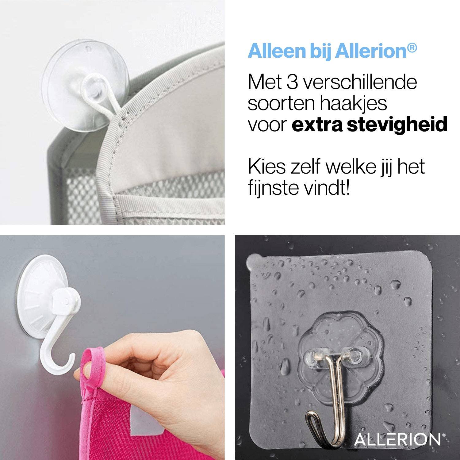 - Zeer gemakkelijk in gebruik door de vele bijgeleverde haakjes en zuignappen