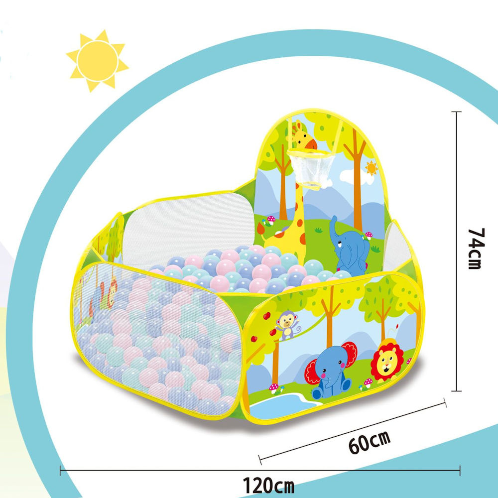 Deze stoffen ballenbak is ideaal voor baby's en kinderen vanaf 6 maanden. Laat je kleine kind lekker met de 100 meegeleverde gekleurde ballenbak ballen spelen. En alles ontdekken, zodat het er lekker in kan spelen en in kan rond kruipen. Tegelijkertijd worden ook spelenderwijs zijn reflexen en hand-oog-coördinatie getraind. Tevens is deze vrolijke balenbak voorzien van een basketbal net, zodat jouw kindjes de ballen door het net kan gooien.