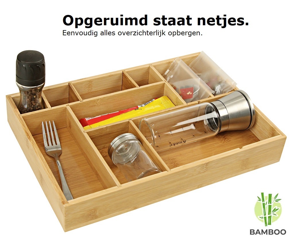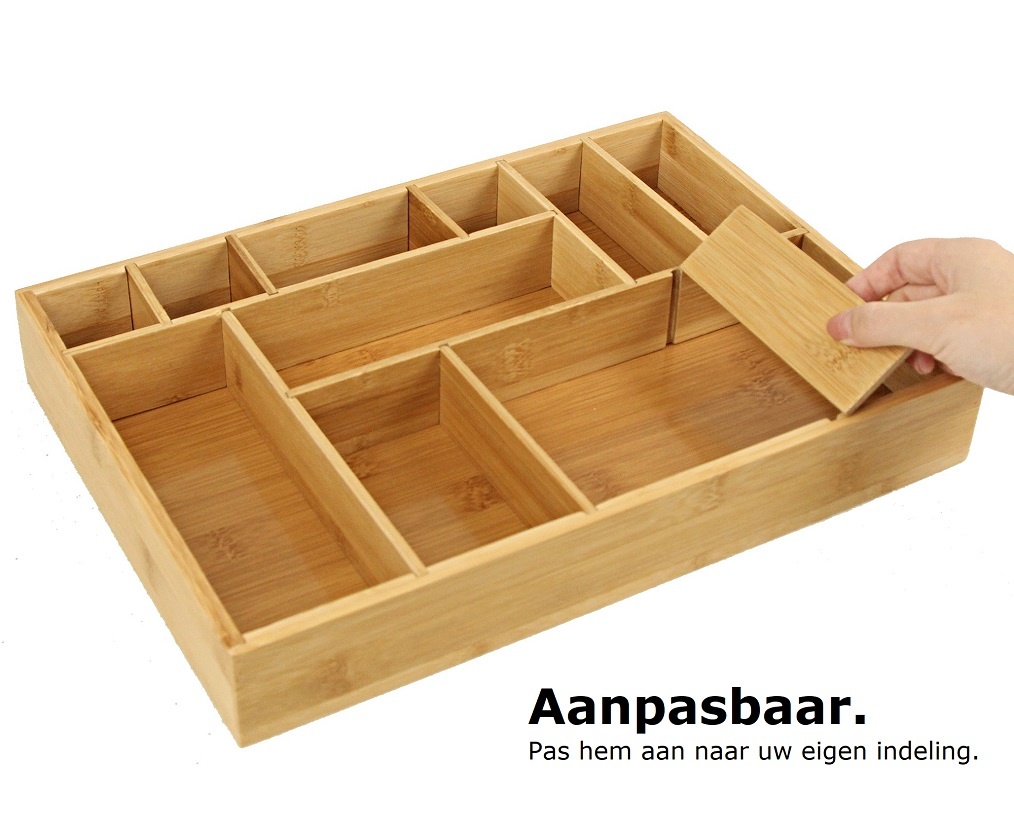 Super handige bamboe bestekbak met uitneembare tussenschotten. Creeer tot wel 11 vakken. Ideaal om je keukenlade te organiseren!
