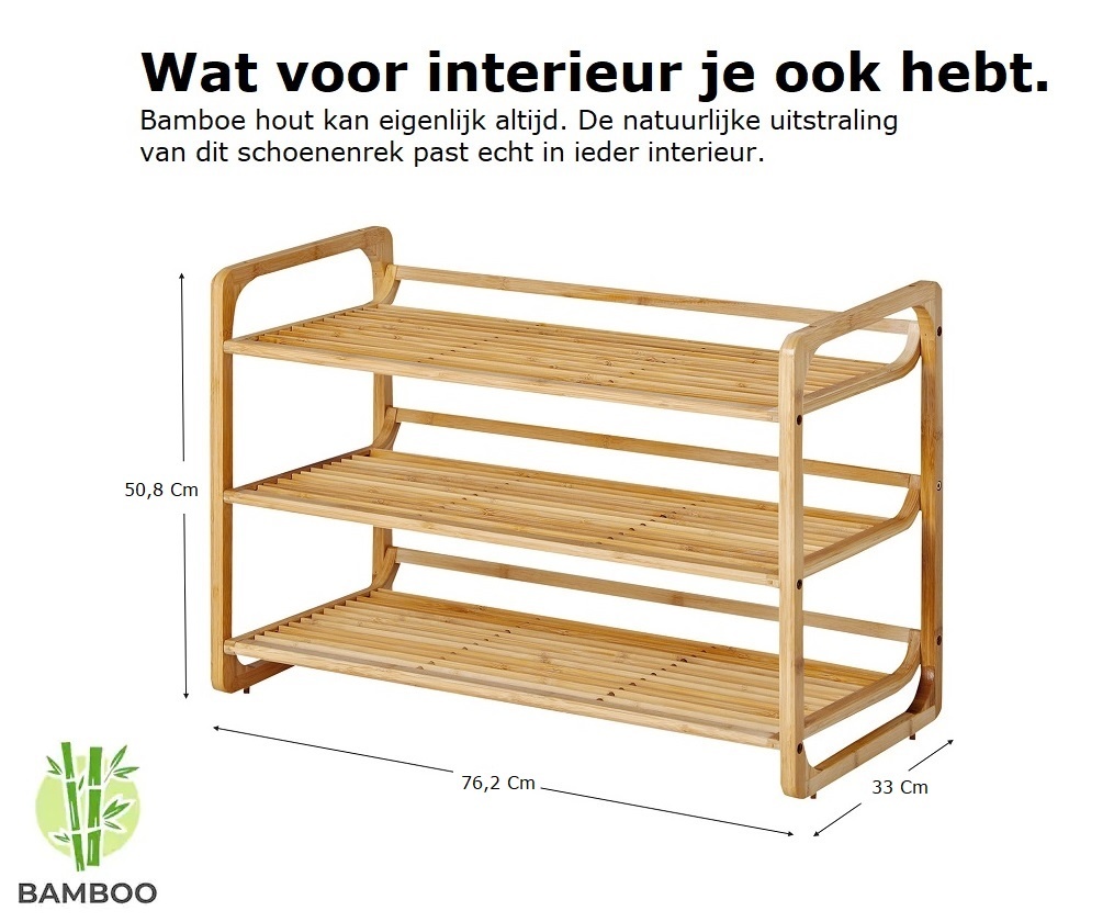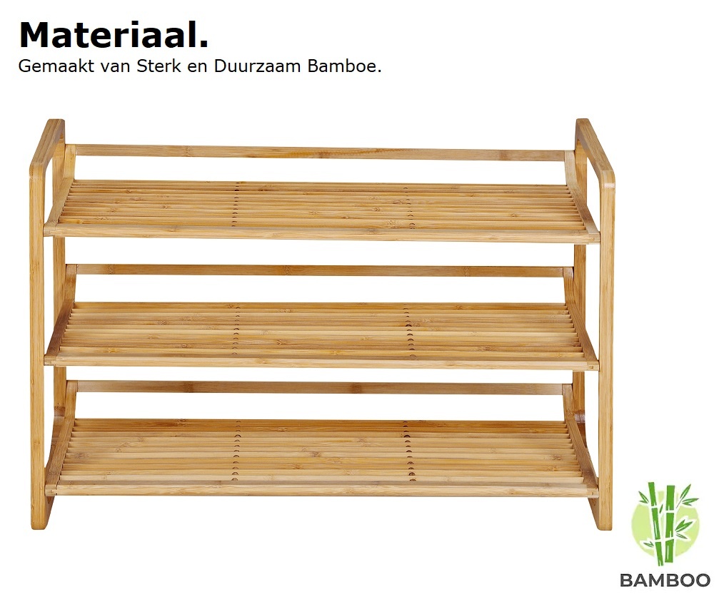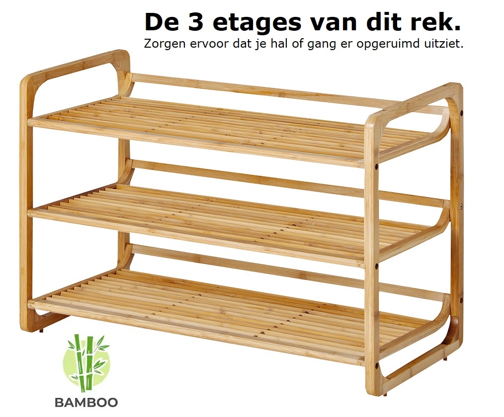 Luxe Bamboe schoenenrek met 3 etages. Geschikt voor 9 tot 12 paar schoenen. Op dit prachtige schoenenrek ruim jij je mooiste schoenen eenvoudig op!