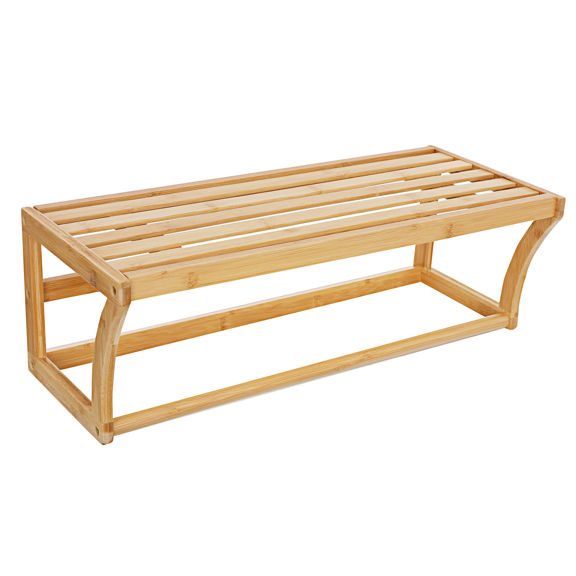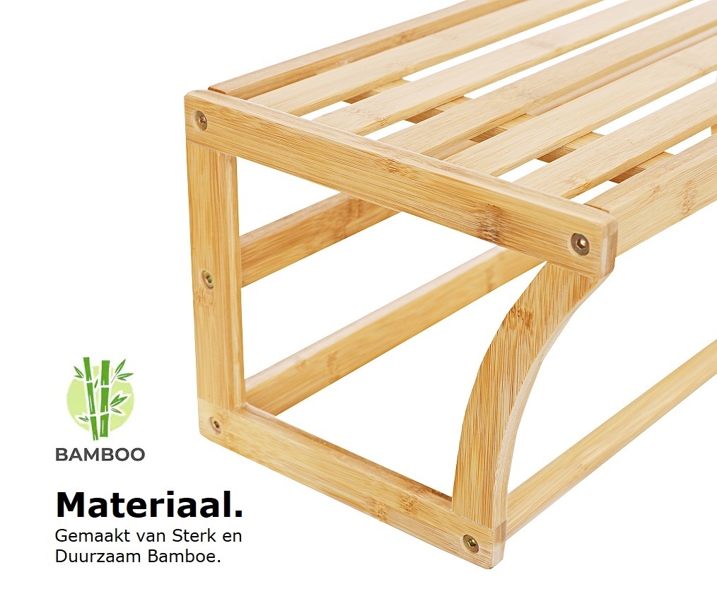 Bamboe wandplank met handdoekenrek voor in je badkamer. Neemt weinig ruimte in en is daarmee ideaal voor in kleine badkamers!
