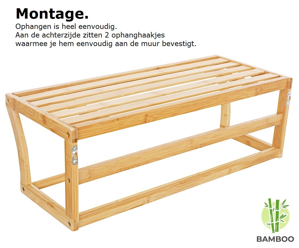 Het rek is gemaakt van bamboe en heeft daardoor een natuurlijke uitstraling. Door zijn natuurlijke uitstraling past hij in elke stijl badkamer. Bamboe is van nature goed bestand tegen water en daardoor is dit wandrek zeer geschikt om in je badkamer op te hangen.
