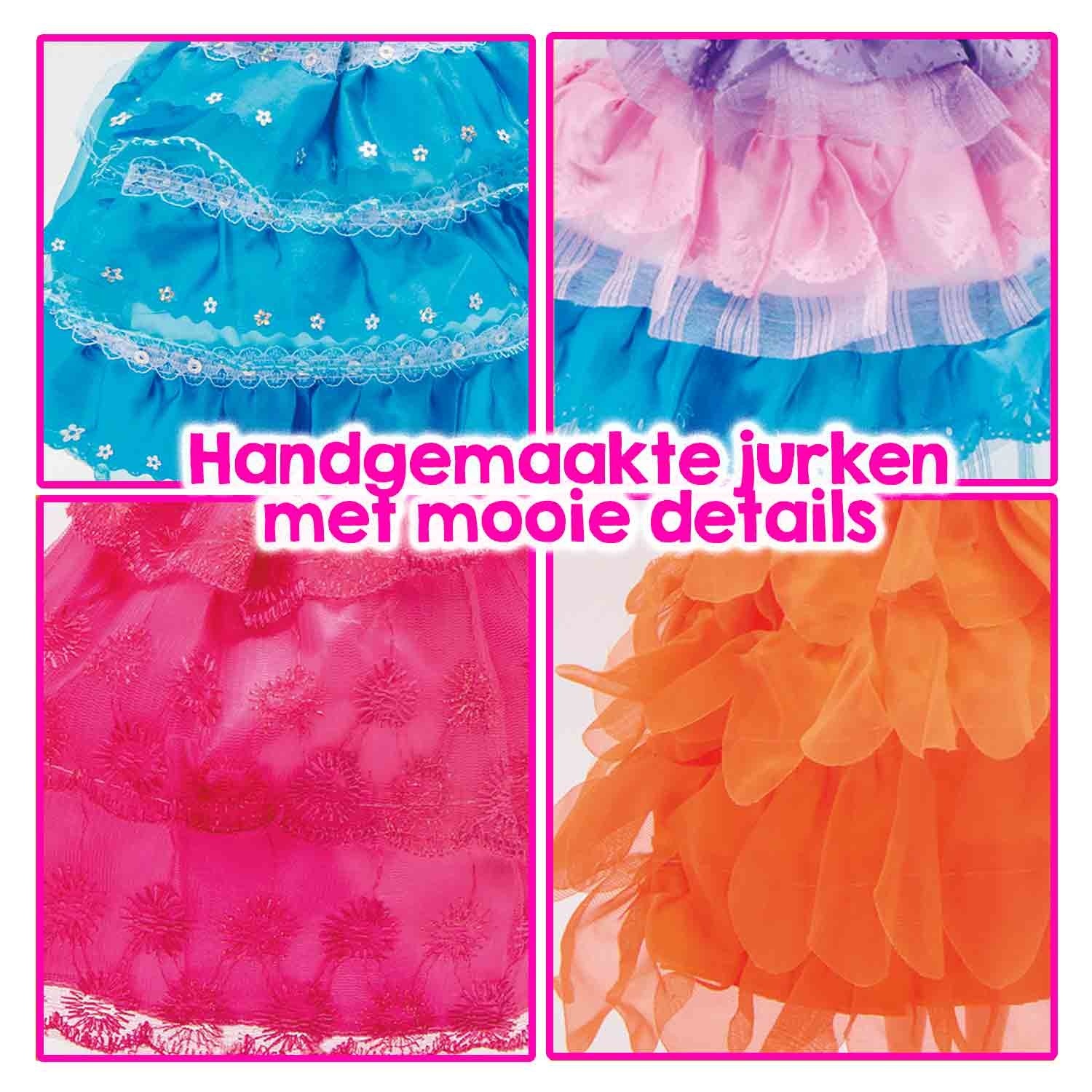 Maar liefst 8 verschillende jurkjes bevat deze set. De jurkjes hebben verschillende ontwerpen, kleuren en stoffen. Zo kun jij de juiste outfit bepalen voor elk moment! In de jurkjes zit elastiek verwerkt, zodat deze gemakkelijk aan- en uit te trekken zijn. De jurkjes zijn erg vrolijk en kunnen als basis dienen voor een feestelijke outfit. Voor eindeloos speelplezier!