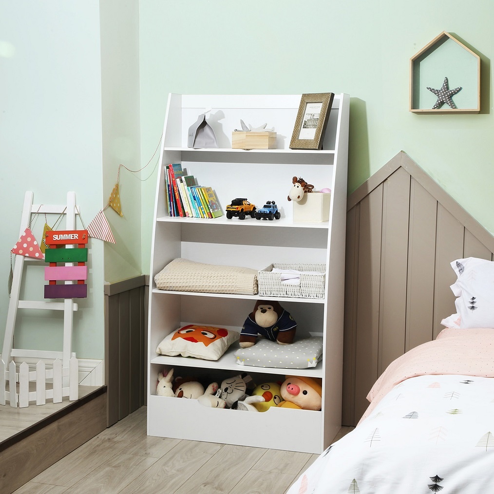 Op de bovenste 4 open etages is genoeg ruimte voor boekjes, foto's, spelletjes, een plantjes etc. De onderste van de 4 legplankjes is ongeveer 40 centimeter diep en 80 centimeter breed. De plankjes daarboven blijven even breed en worden steeds iets minder diep. De kast heeft een speels design waardoor hij goed past op een kinderkamer.