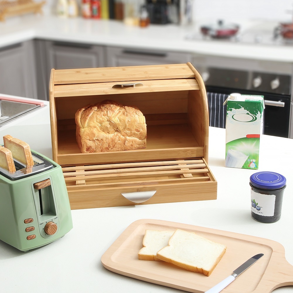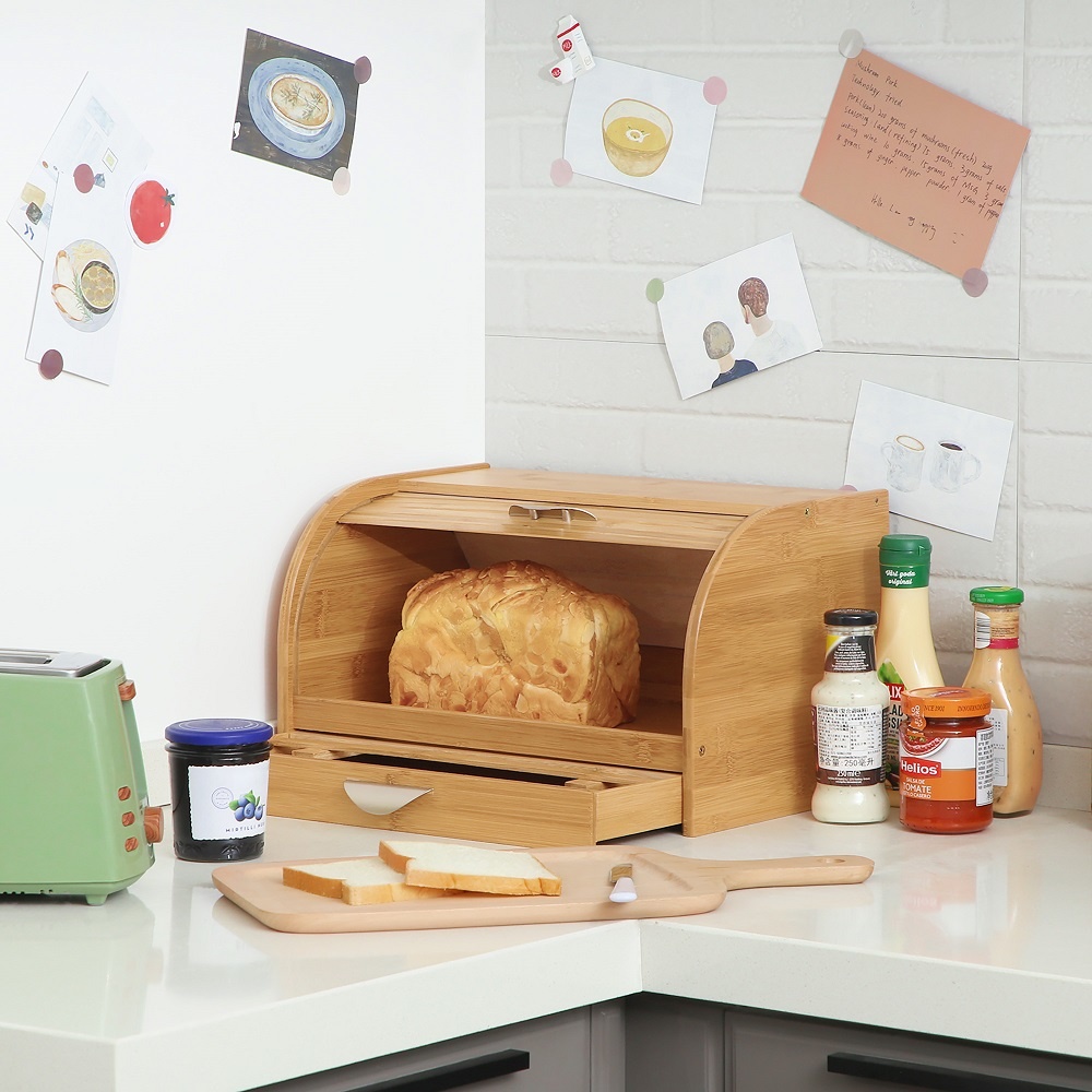 In het design is rekening gehouden met dagelijks gebruik. Dat blijkt uit alles. Zo zit er aan de schuifdeksel een handvat waardoor je hem makkelijk open en dicht schuift. Daarnaast is er op een slimme manier een snijplank geïntegreerd in deze luxe houten broodtrommel. Onder de brooddoos zit namelijk een extra compartiment. Schuif deze uit en er verschijnt een snijplank. Op deze snijplank snij je het brood en over kruimels hoef je je geen zorgen te maken. Deze vallen direct in de opvangbak.