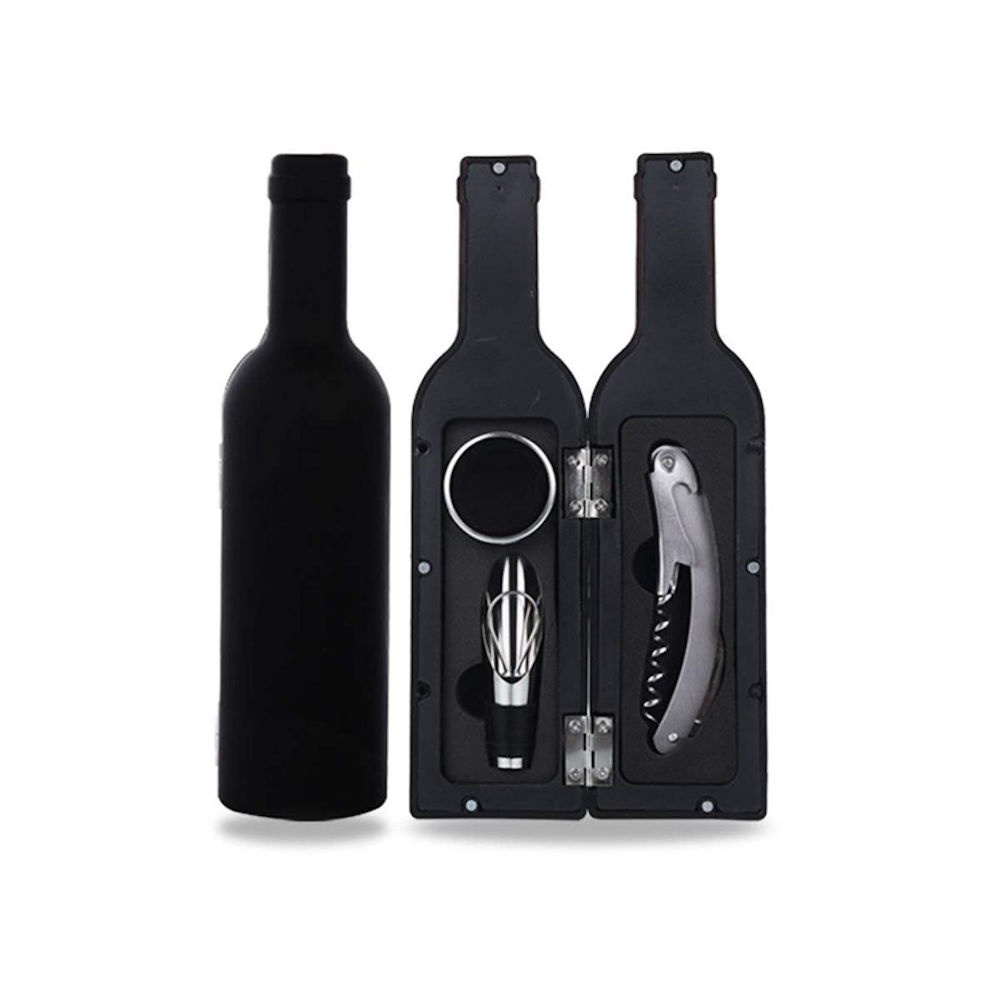 Decopatent Decopatent® 4-Delige Luxe Wijnset in Wijnfles vorm - Wijn fles accessoires Set - Wine tools - Wijn Kurken trekker - In Luxe Fles opbergbox - Cadeau set