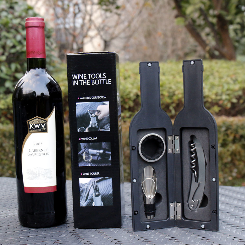 Deze prachtige 4-Delige wijn accessoire set is geschikt voor elke wijnliefhebber. De complete wijn set wordt in een Wijnfles vorm opbergdoos geleverd en bevat al de benodige wijn accessoires die u als wijndrinker nodig heeft.