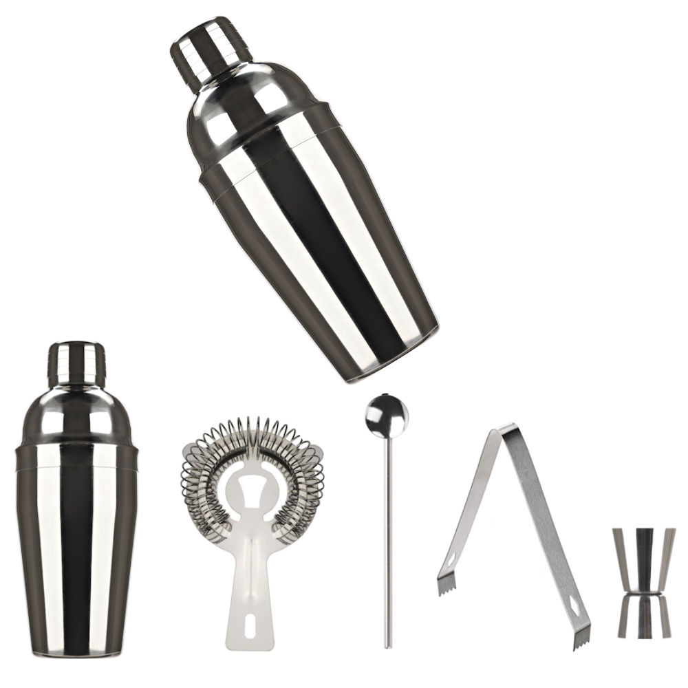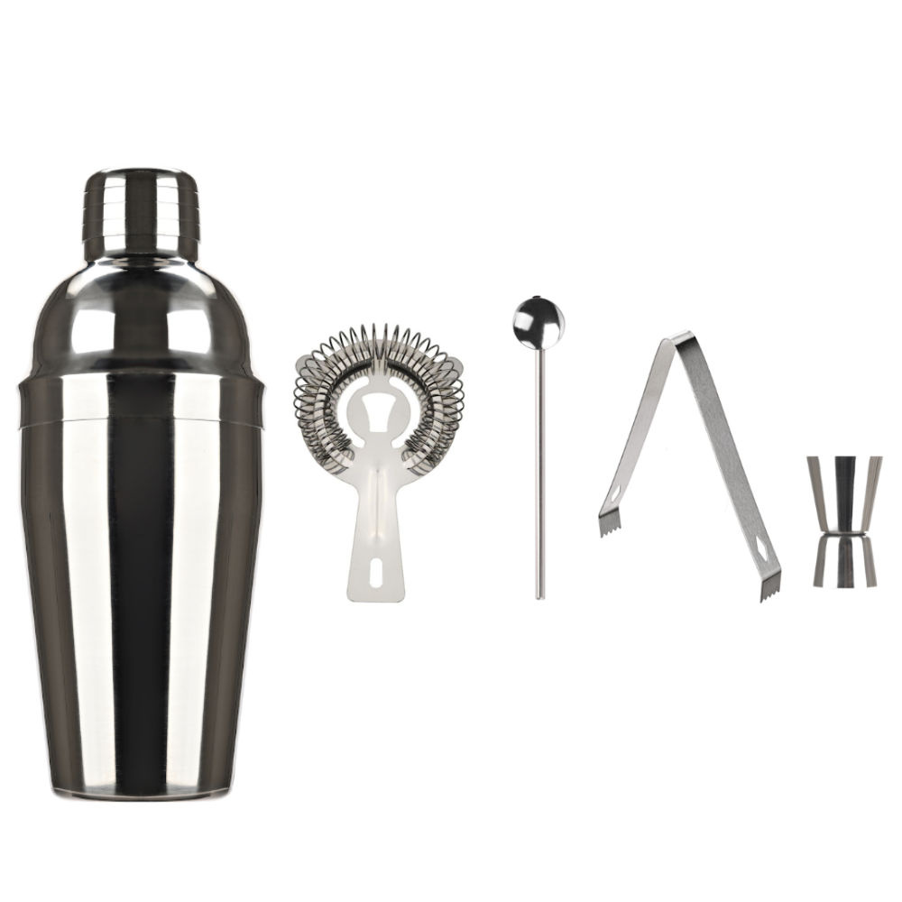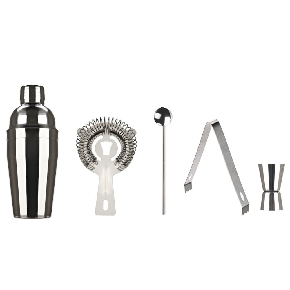 Cocktail Set 5-delig. Professionele barset met Shaker, maatbeker, zeef, ijsblokjestang, cocktaillepel. Maak jouw cocktail als een professionele barkeeper