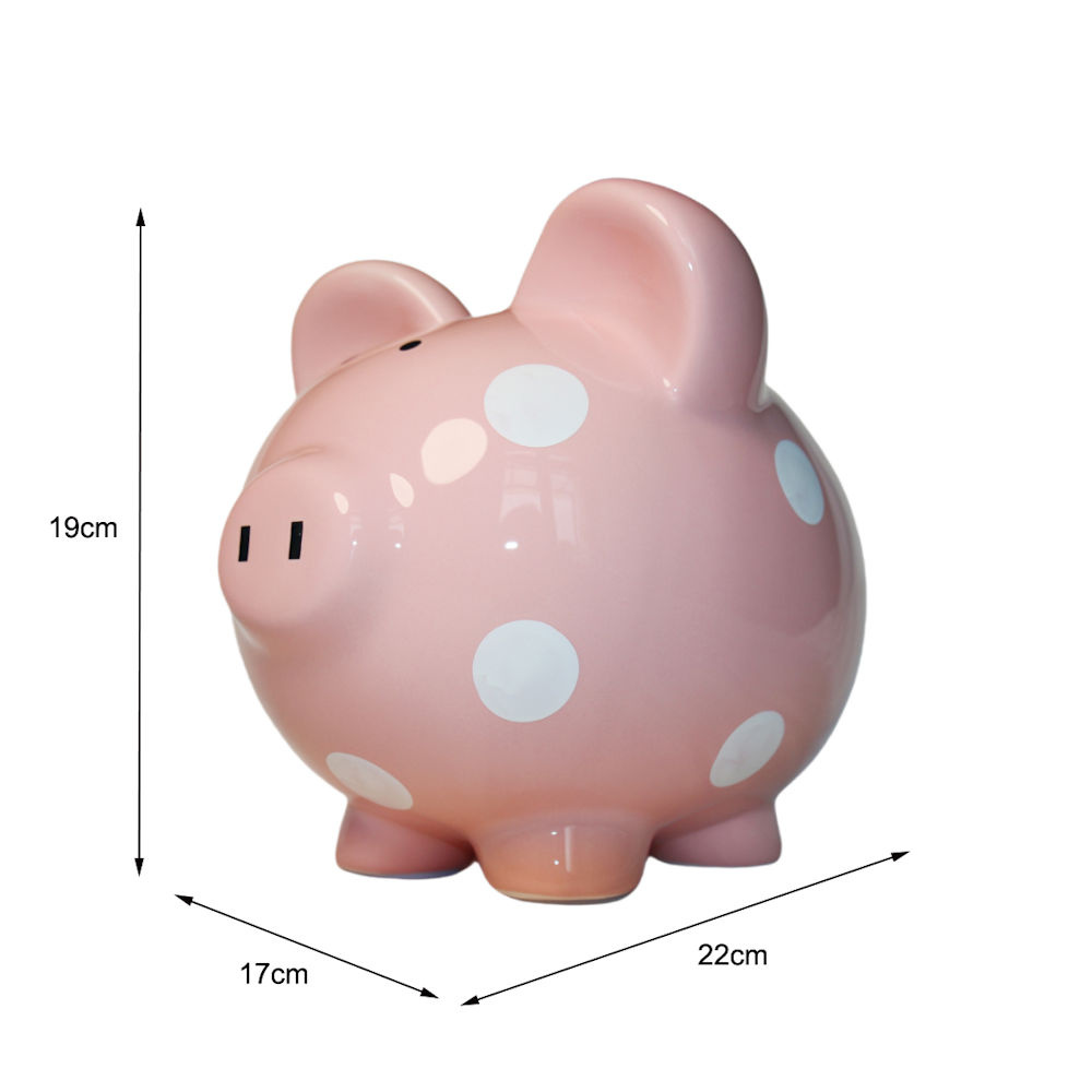 Deze grote spaarpot heeft een afmeting van 22 cm (lengte) x 17 cm (breedte) x 19 cm (hoogte), wat het een uitstekende maat maakt voor op een bureau, kast of een ander zichtbaar plekje in huis. Het keramiek heeft een glanzende afwerking die zorgt voor een luxe uitstraling. Dankzij het stevige materiaal gaat deze spaarpot jarenlang mee, zelfs bij dagelijks gebruik.