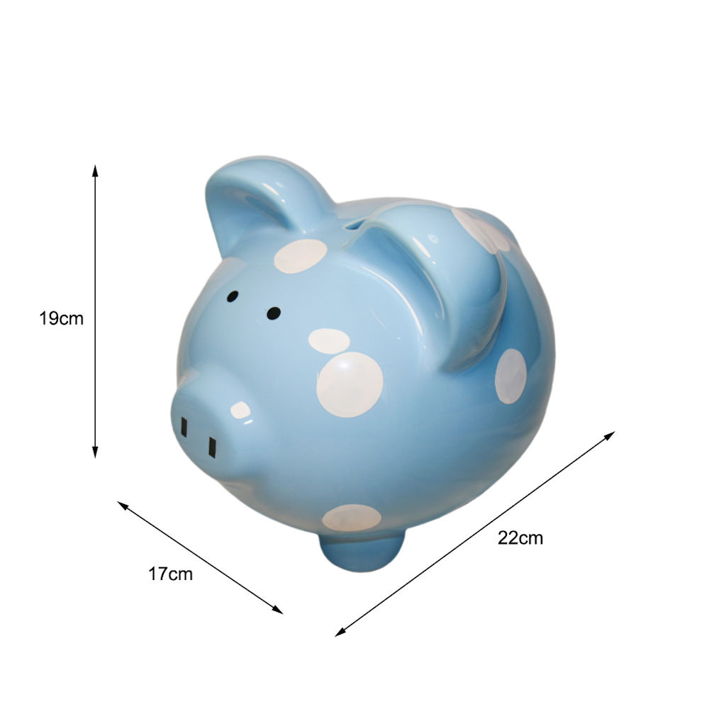 Deze grote spaarpot heeft een afmeting van 22 cm (lengte) x 17 cm (breedte) x 19 cm (hoogte), wat het een uitstekende maat maakt voor op een bureau, kast of een ander zichtbaar plekje in huis. Het keramiek heeft een glanzende afwerking die zorgt voor een luxe uitstraling. Dankzij het stevige materiaal gaat deze spaarpot jarenlang mee, zelfs bij dagelijks gebruik.