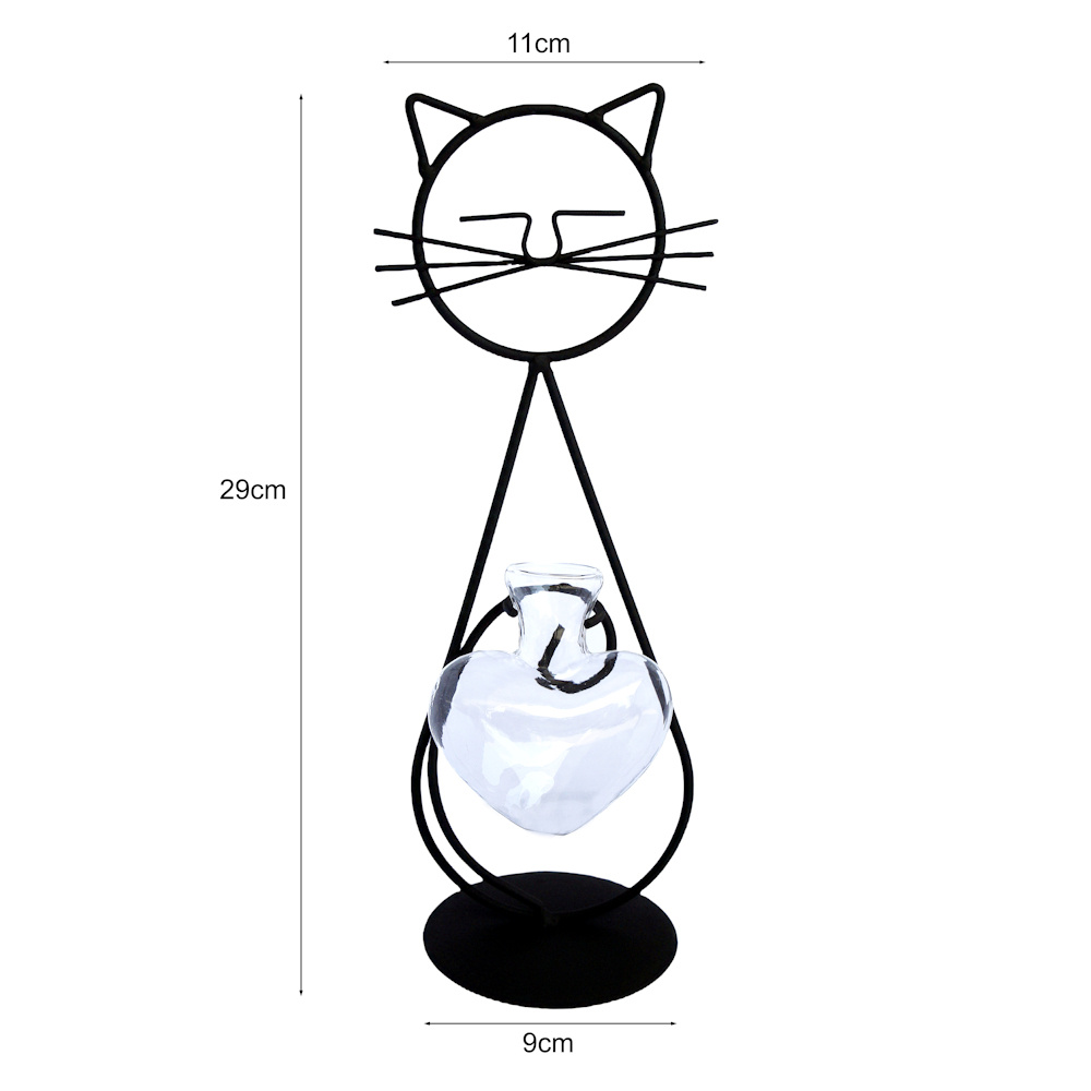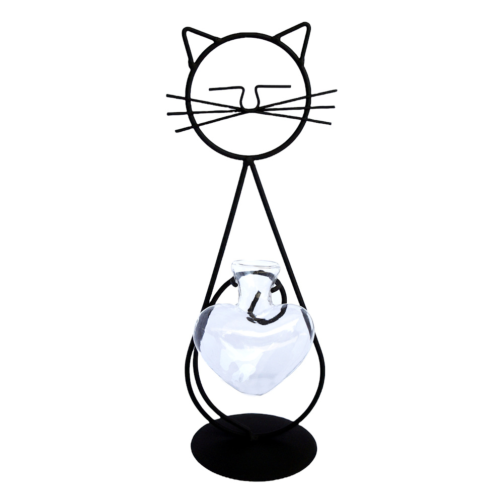 Decopatent - IJzeren Staande Poes met vaasje in hartvorm - kat - glazen vaas - vaas glas - Om bloemetjes, stekjes, droogbloemen of luchtplantjes in te zetten