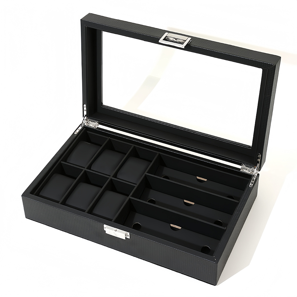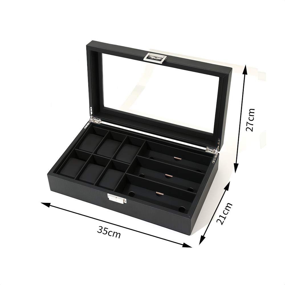 De opbergdoos biedt ruimte aan 6x horloges en 3x zonnebrillen, waardoor je jouw complete collectie op één plek kunt organiseren. De zachte zwarte inleg voorkomt krassen en beschadigingen, terwijl het stevige PU-leder zorgt voor een luxe uitstraling en langdurig gebruik. Dankzij het transparante deksel heb je in één oogopslag zicht op je collectie, zonder de doos te openen.