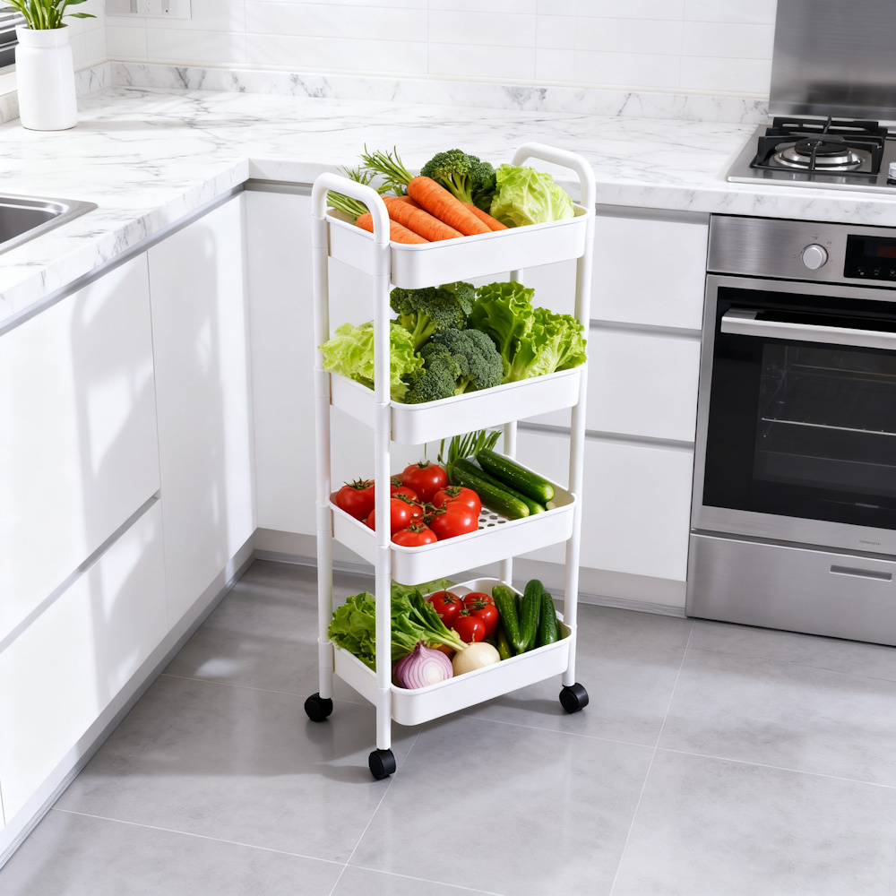 Te gebruiken als keukentrolly in uw keuken, om bijvoorbeeld uw extra voorraad, specerijen etc in op te bergen. Ook zeer geschikt als badkamerrek om uw shampoo, handdoeken, toilet spullen etc in op te bergen. Het rekje is erg praktisch doordat er 4 niveaus voor opslag mogelijk zijn.