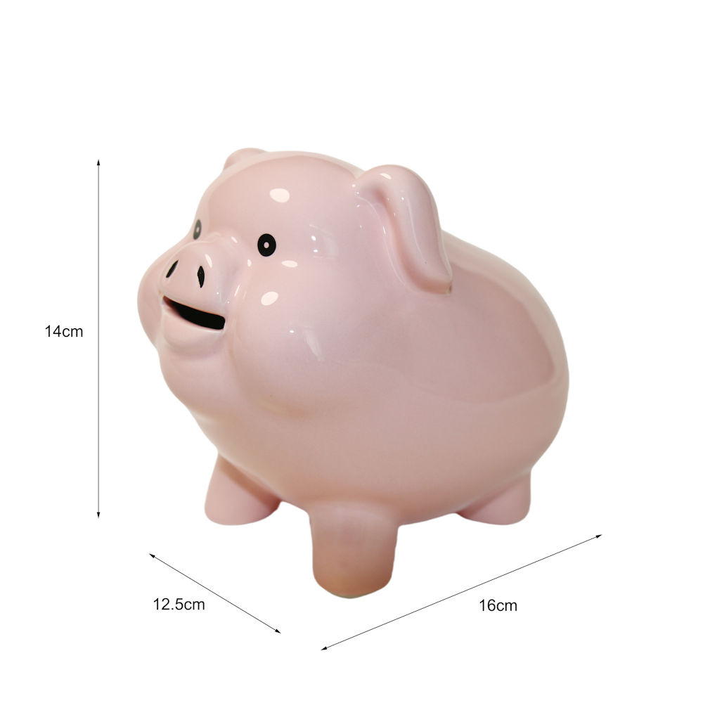 Deze spaarpot heeft een afmeting van 16 cm (lengte) x 12,5 cm (breedte) x 14 cm (hoogte), wat het een uitstekende maat maakt voor op een bureau, kast of een ander zichtbaar plekje in huis. Het keramiek heeft een glanzende afwerking die zorgt voor een luxe uitstraling. Dankzij het stevige materiaal gaat deze spaarpot jarenlang mee, zelfs bij dagelijks gebruik.