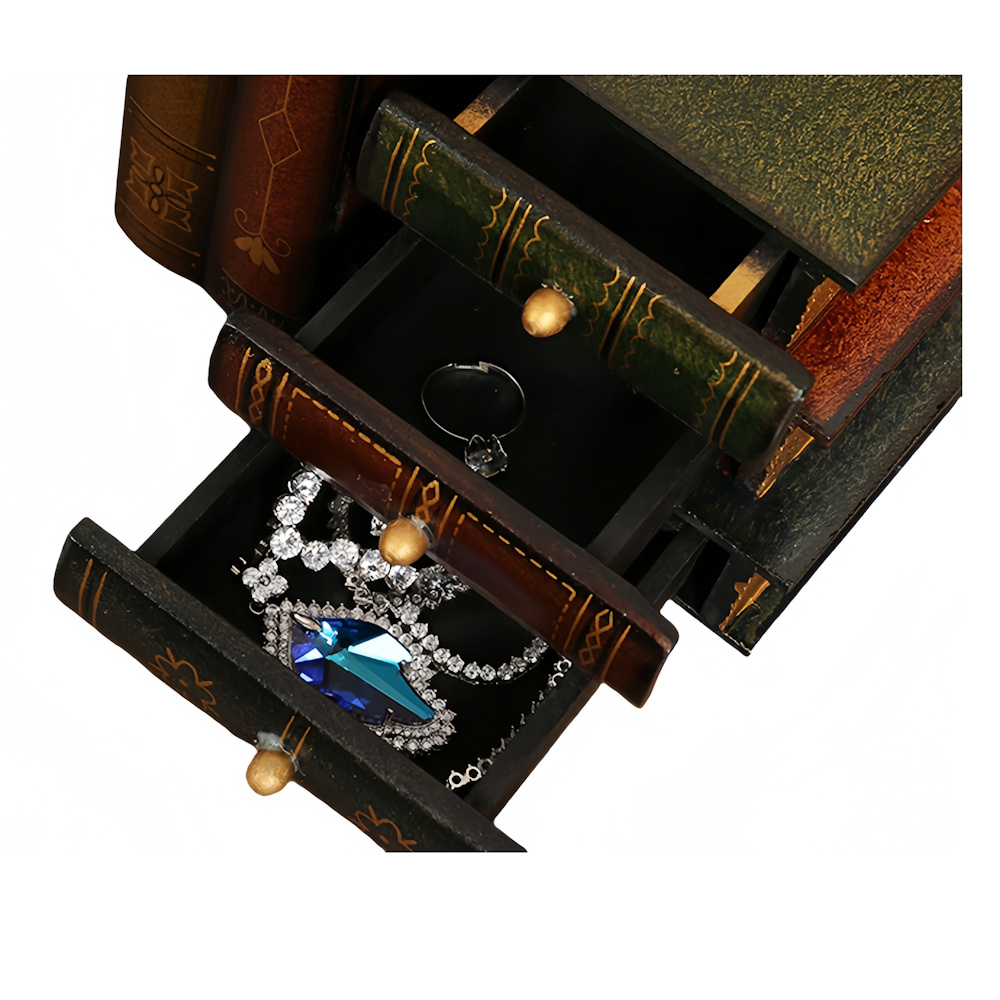 De ingebouwde opberglades zijn subtiel weggewerkt achter het boekontwerp, wat zorgt voor een unieke combinatie van stijl en functionaliteit. Dit maakt deze set ideaal als cadeau voor boekenliefhebbers, leraren, studenten of als opvallend decoratief element in je woonkamer, kantoor of studeerkamer.