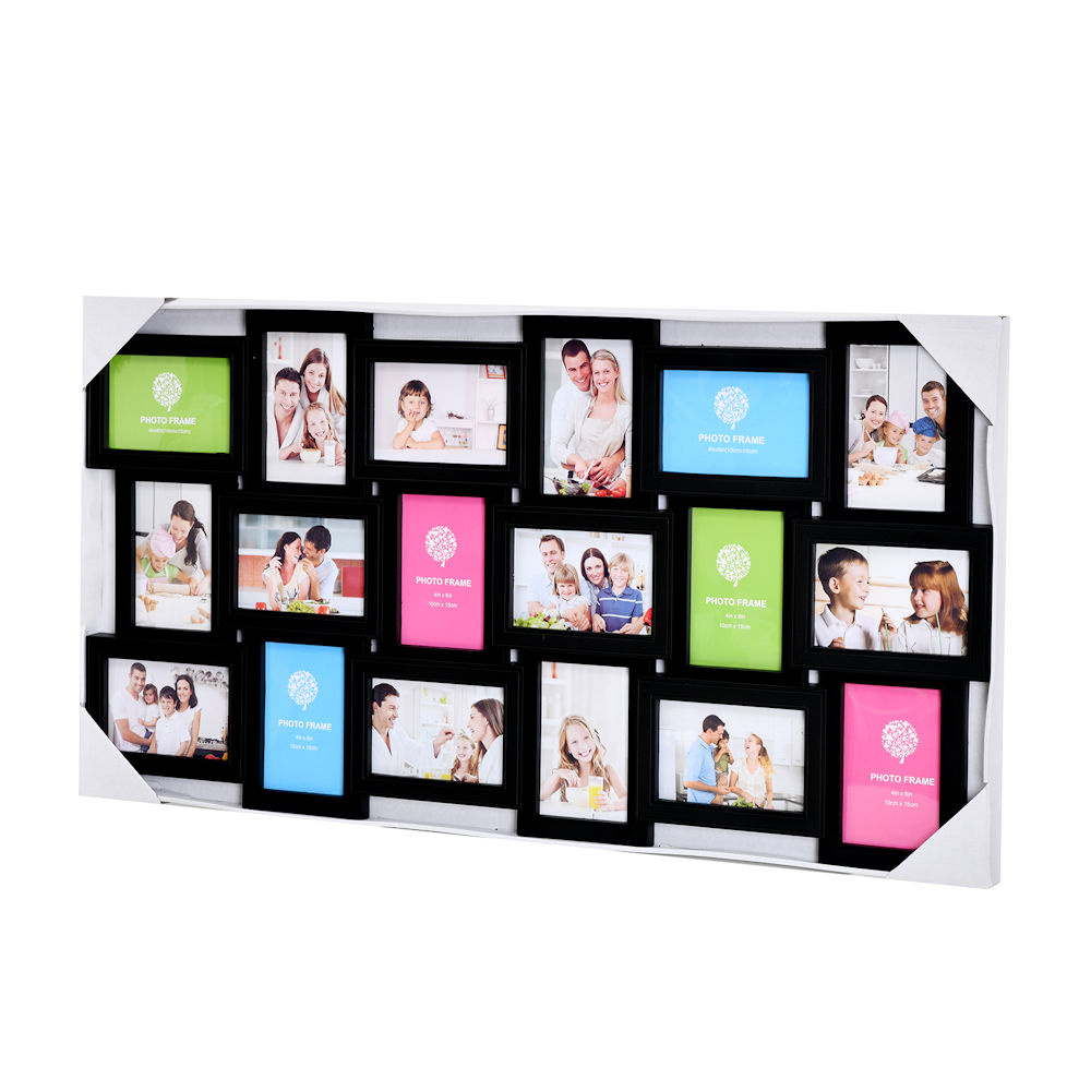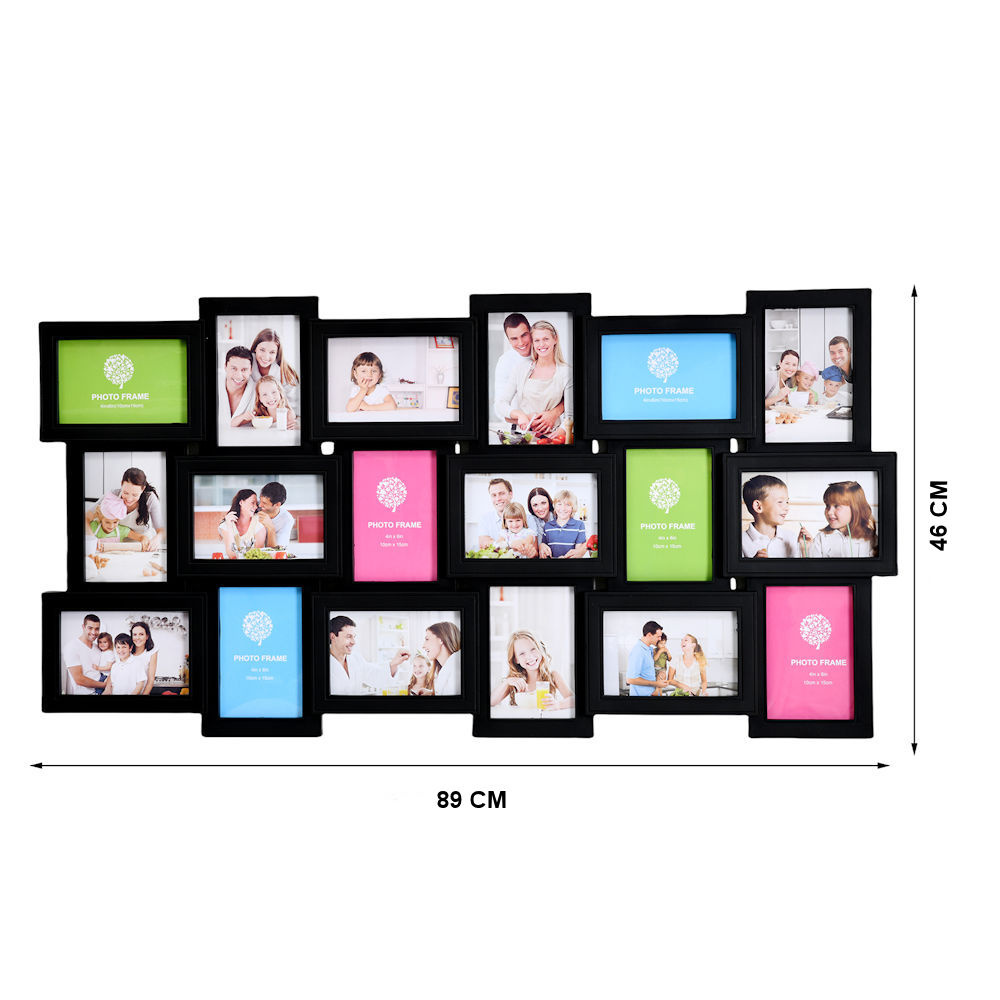 XL Foto Collagelijst voor 18 foto's van verschillende foto formaten: 10 x 15 & 15 x 10 Cm. Voor je mooiste foto's! Met stevige achterkant voorzien van wand ophanghaak en gemaakt van kunststof. Dankzij de ophang haken aan de achterkant kan je zelf bepalen of hij verticaal of horizontaal wordt opgehangen.