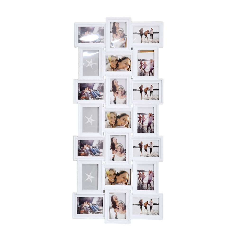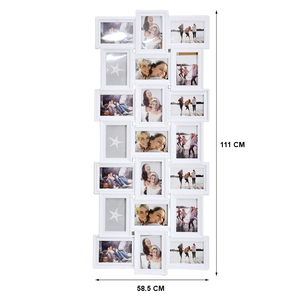 XL Foto Collagelijst voor 21 foto's van verschillende foto formaten: 10 x 15 & 15 x 10 Cm. Voor je mooiste foto's! Met stevige achterkant voorzien van wand ophanghaak en gemaakt van kunststof. Dankzij de ophang haken aan de achterkant kan je zelf bepalen of hij verticaal of horizontaal wordt opgehangen.