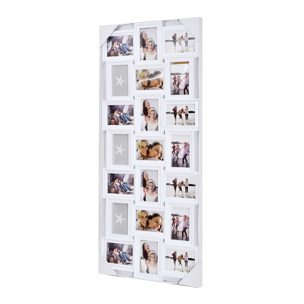 Alle foto‘s van die geweldige momenten welke je met je familie, vrienden of op vakantie hebt meegemaakt slingeren nu nog vaak rond in je la of op de harde schijf van je computer of telefoon? Deel met deze grote fotolijst deze prachtige foto's met de nieuwsgierige kijkers! Creëer zelf een persoonlijke fotocollage met behulp van deze uiterst decoratieve fotolijst. Hij biedt ruimte voor in totaal 18 foto‘s. Dankzij de ophang haken aan de achterkant kan je zelf bepalen of hij verticaal of horizontaal wordt opgehangen.
