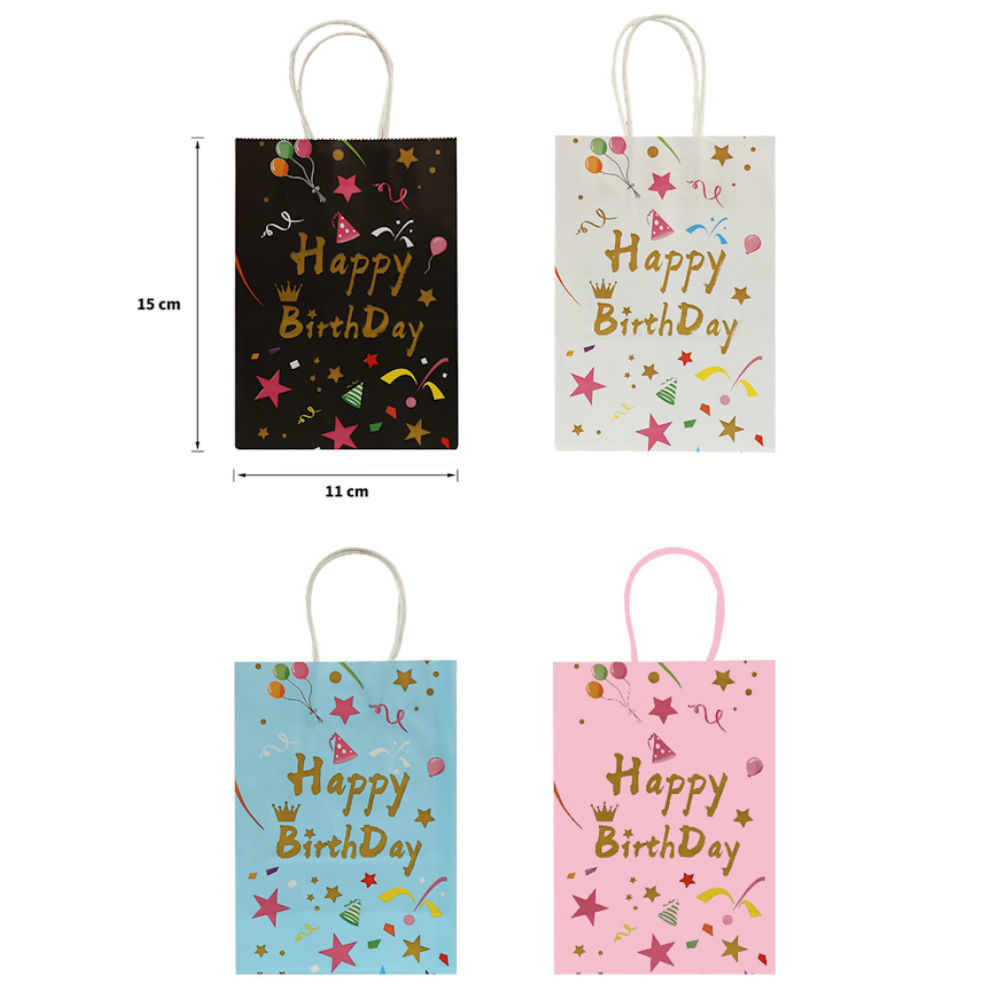 Deze papieren uitdeel / traktatie tasjes worden in Mix kleuren geleverd, met de Happy Birthday print. kleuren: Zwart, Wit, Blauw, Rose met Happy Birthday feest print