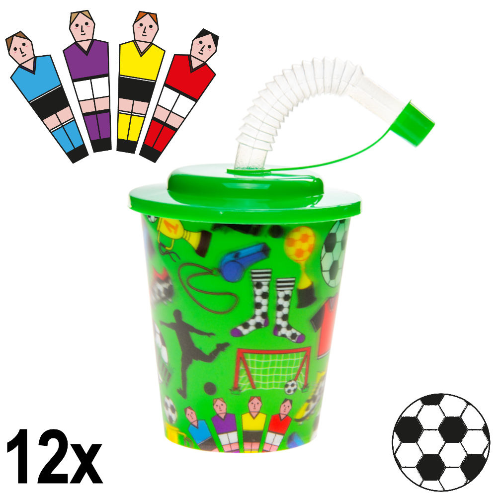 Decopatent Decopatent® 12 STUKS VOETBAL 3D Drink Beker met Rietje en Deksel - 250ML - Voetballers Plastic Bekers - Kinderfeestje - Kinderverjaardag Bekertjes - Traktatie - Uitdeelcadeaus