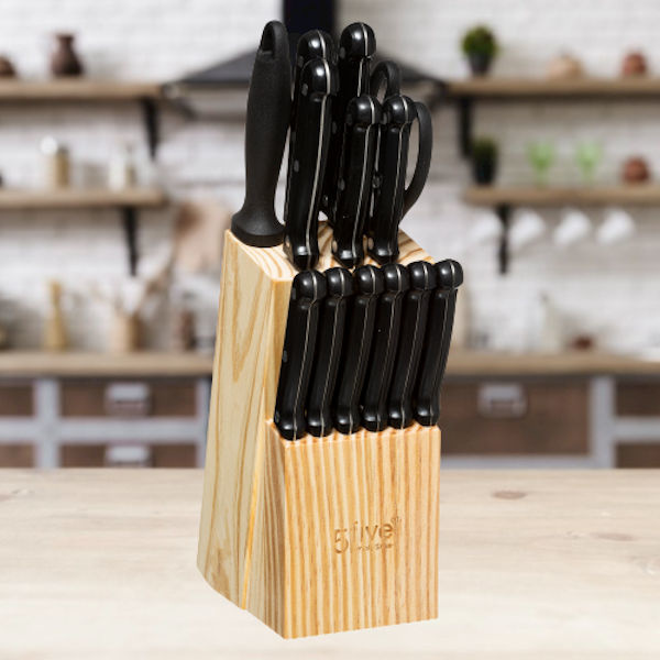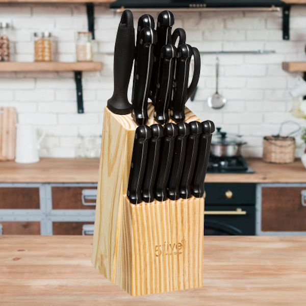 Met deze stijlvolle houten Messenblok inclusief: Messenblok, 6x Rvs steakmessen (Diverse soorten & maten), 5x Rvs Keukenmessen (Diverse soorten & maten), 1x Keukenschaar & 1x Messenslijper maak je een einde aan de rommel op jouw aanrecht.