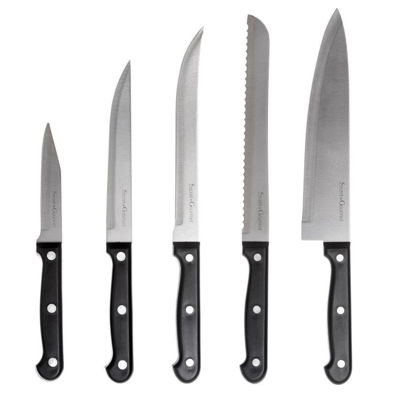 Met deze complete keukenmessen set met daarin het houten messenblok en het koksmes, broodmes, vleesmes, universeel mes en schilmes heb je altijd al je keukenmessen bij de hand. Tevens voorzien van messenslijper en universele keukenschaar.