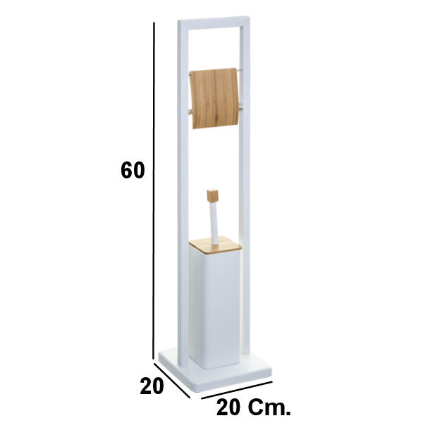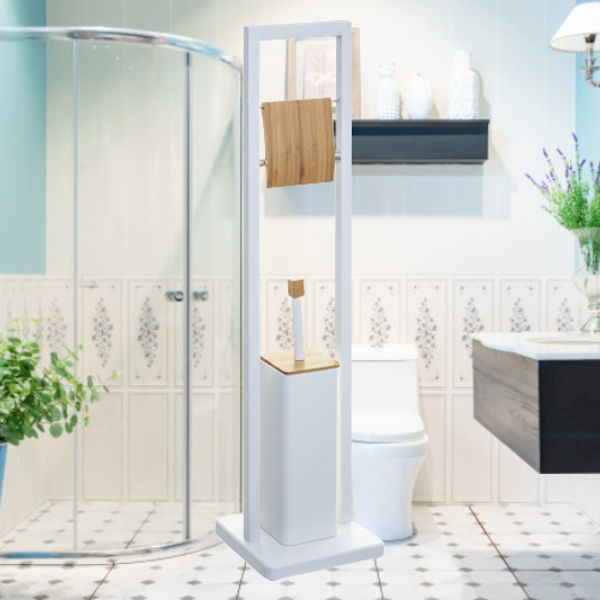 Deze 2in1 staande wc rolhouder & Toiletborstel met houder helpt, de ruimte in de badkamer of toilet ruimte optimaal te gebruiken. Dankzij de bovenste wcrol houder met klep, heb je jouw toiletpapier altijd binnen handbereik. Tevens is deze voorzien van een toiletborstel met houder. Deze toiletrolhouder & toiletborstel met houder heeft een prachtig design en is gemaakt van metaal en Bamboe.