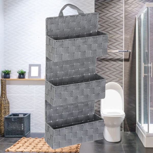 ✅ 3 Laags Hangend gevlochten badkamerrek met 3 manden ✅ Badkamermand, Om op te hangen aan de muur ✅ Neemt weinig ruimte in en past daarmee in elke badkamer! ✅ Kleur: Licht Grijs