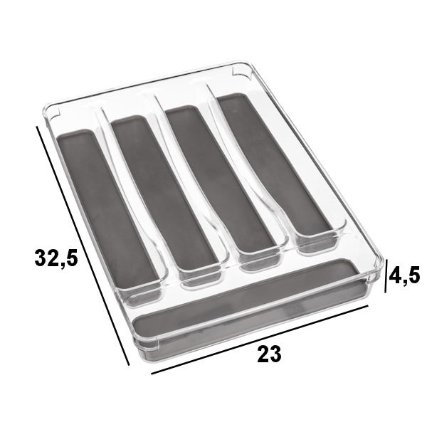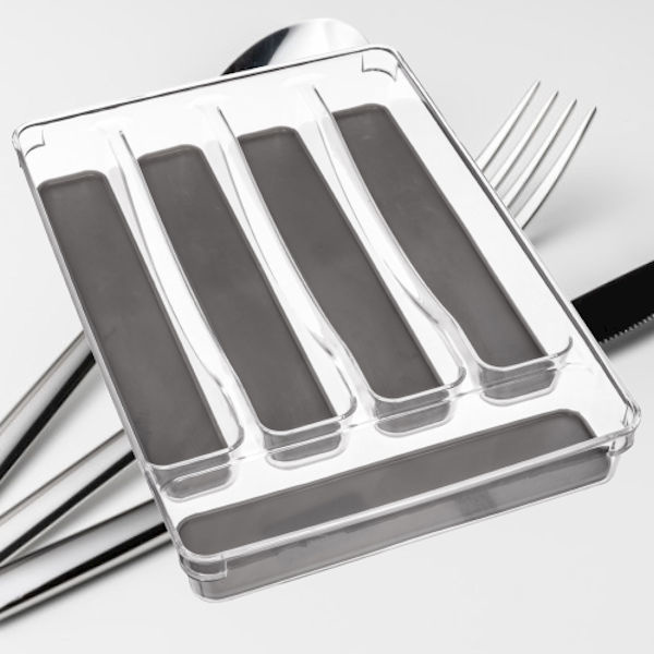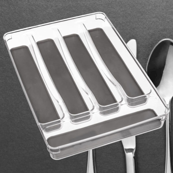 Deze bestekbak is doorzichtig en voorzien van een anti slip grijze inleg, waardoor jouw bestek altijd netjes op zijn plaats blijft liggen.