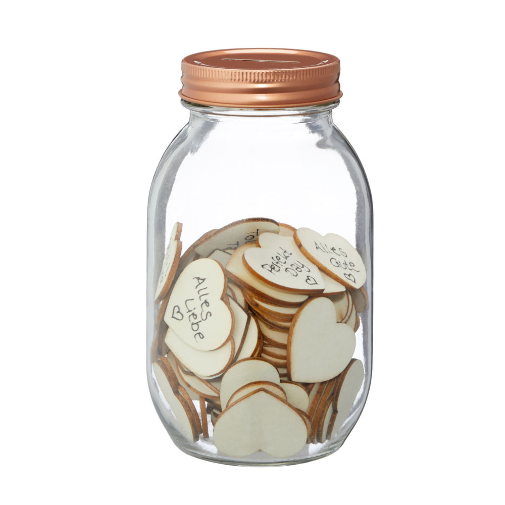 Decopatent Decopatent® Gastenboek Wenspot met 100 houten hartjes - Glazen wenspotje met houten wenshartjes - Bruiloft decoratie - Huwelijk - Gastenboek