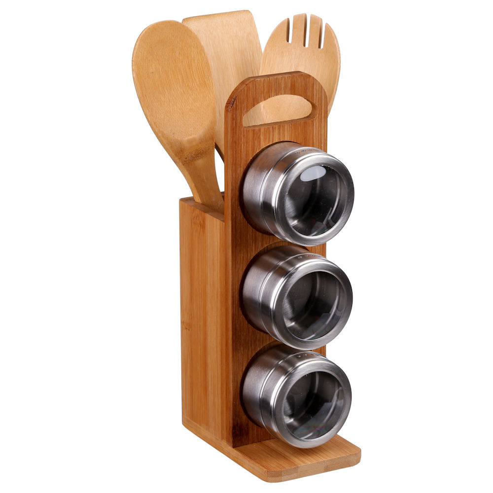 Decopatent Decopatent® Keuken Spatelset en Magnetische Kruidenpotjes op Bamboe houder - 3x Kruidenpotjes en 3x Houten Spatels