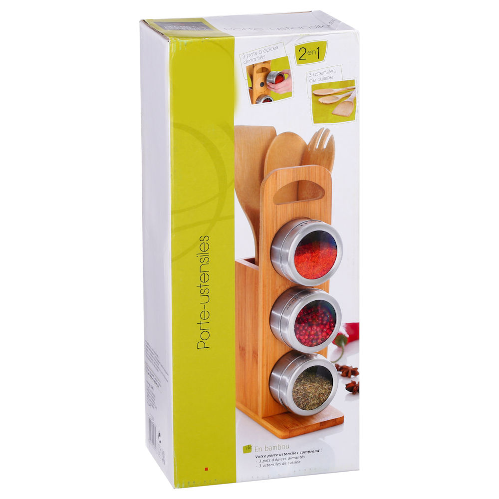 ✅ Bestaande uit: 1x Keukengerei houder + 3x verschillende soorten houten spatels + 3 magnetische kruidenpotjes.