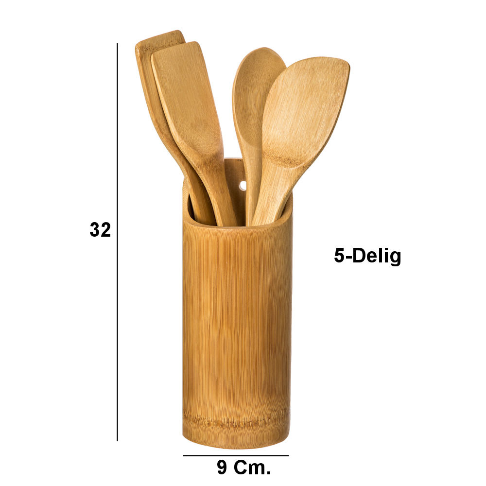 5-delige Houten Bamboe Keukengerei Set. Met deze mooie keukengerei set van bamboe heeft u het belangrijkste keukengerei altijd bij de hand. De 5-delige set bestaat uit een ronde bamboe houder met 4 verschillende soorten spatels.