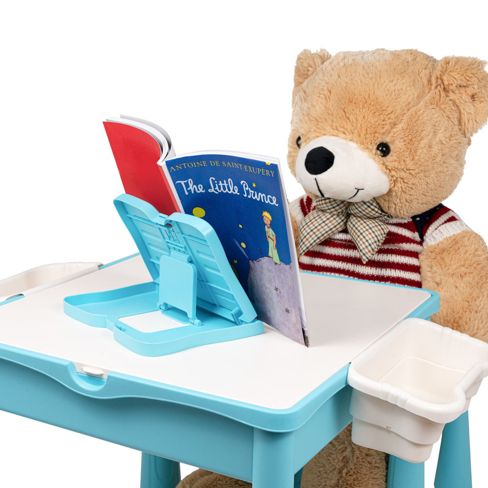Deze multifunctionele kindertafel kan je kindje gebruiken als: Bouwtafel, Zandtafel, Watertafel of Kindertafel. Deze complete set wordt tevens geleverd inclusief een verstelbare Boekenstandaard. Zodat jouw kindje ook rustig kan lezen aan deze tafel.