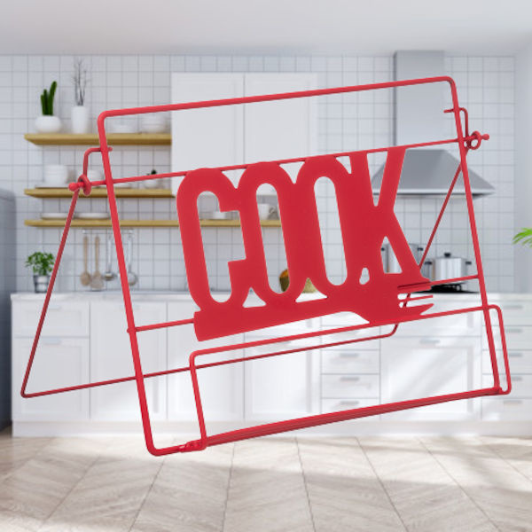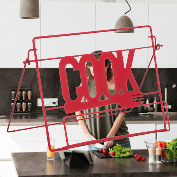 Deze luxe keuken kookboek standaard is gemaakt van metaal en zeer geschikt voor gebruik in de keuken. En voorzien van een preachtig COOK Design. Door zijn mooie uiterlijk is hij uiteraard ook geschikt om in de woonkamer of slaapkamer neer te zetten, als boekenstandaard