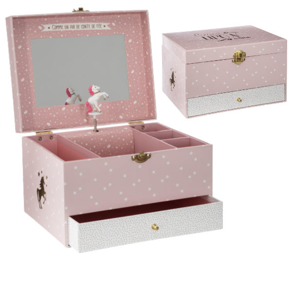 Voor de echte meisjes meisjes deze roze sieradendoos. Iedere keer als je er iets uitpakt, begint de melodie te spelen en begint de Unicorn (Eenhoorn) te dansen.