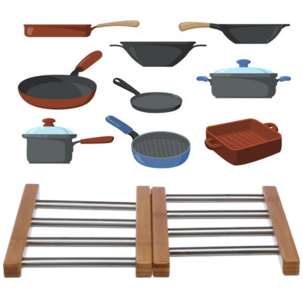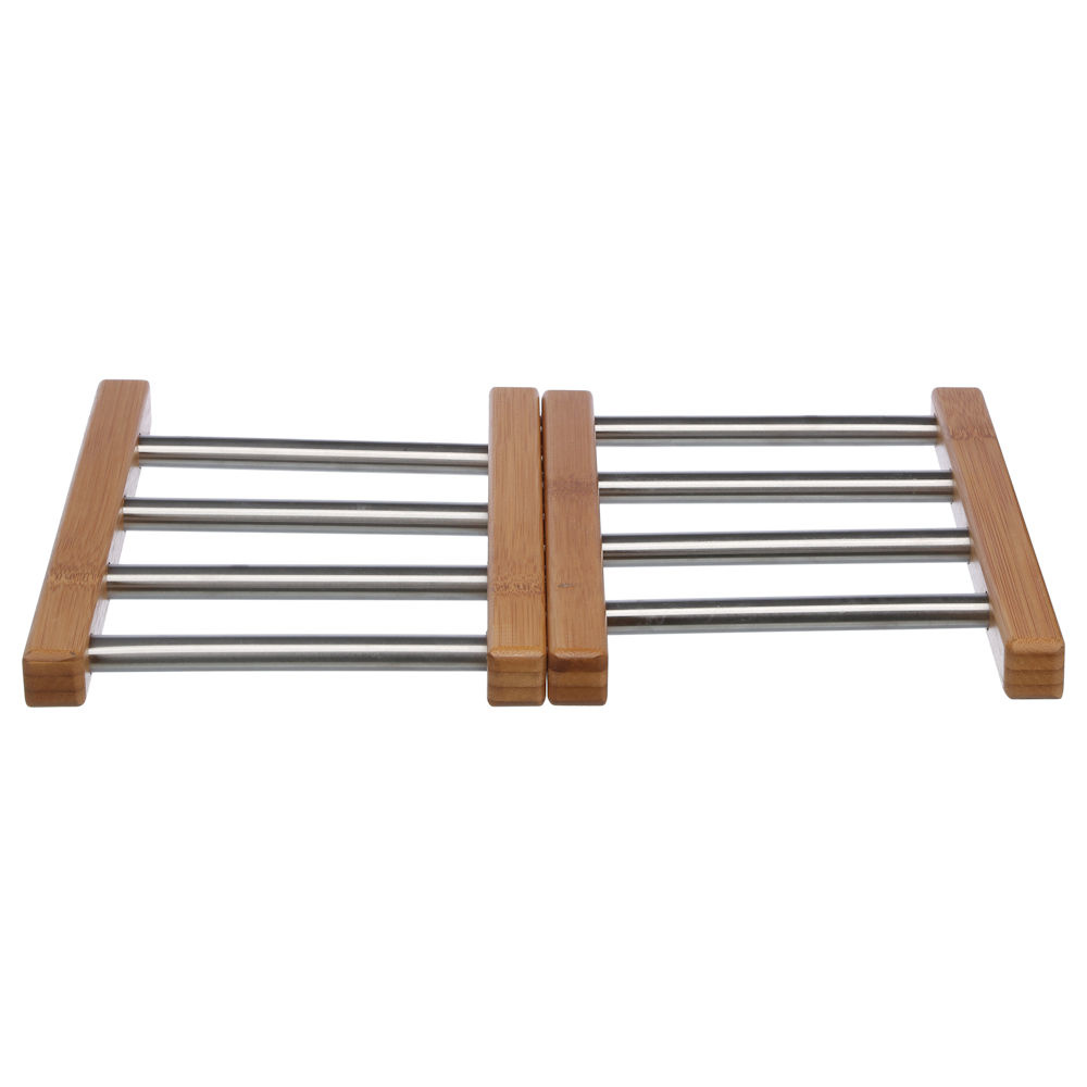 Ook zat van vlekken en kringen op de tafel of op het aanrecht? Dan is deze van Bamboe Hout en Rvs metaal gemaakte uitschuifbare pannenhouder / onderzetter de oplossing! Kan universeel gebruikt worden om pannen en ovenschalen op te zetten. Deze pannenhouder is hittebestendig.
