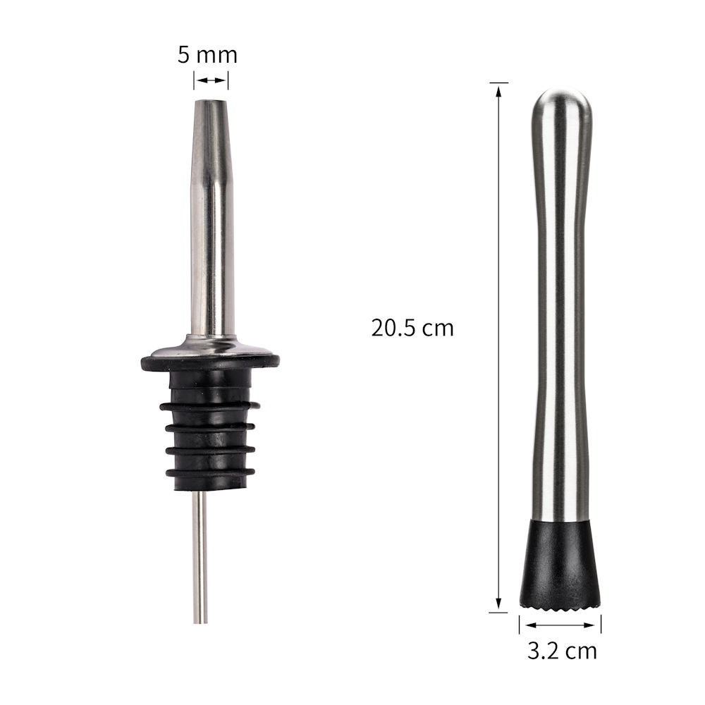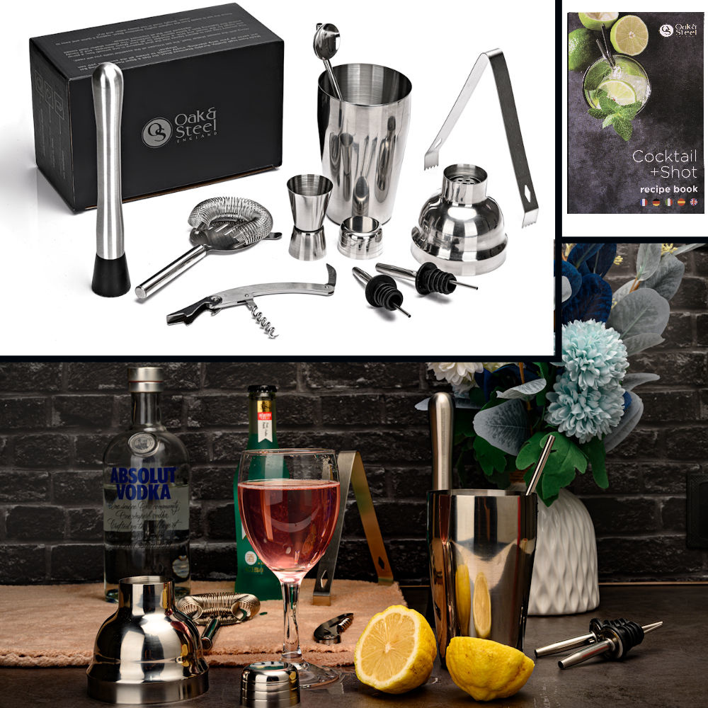 ✅ Inhoud Set: Rvs Cocktail Shaker, maatbeker, ijsblokjestang, cocktail lepel, coktail zeef, 2x flessen schenktuit, zakmes met flessenopener, cocktail stamper