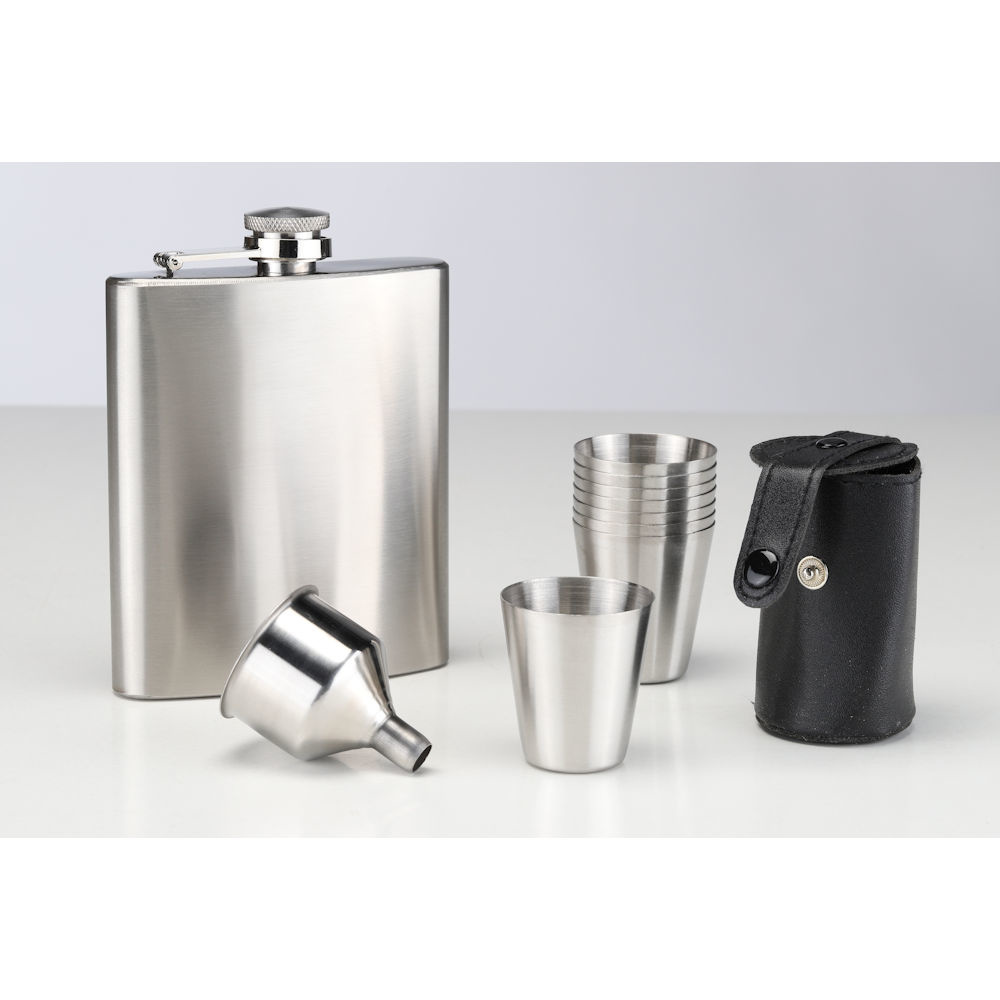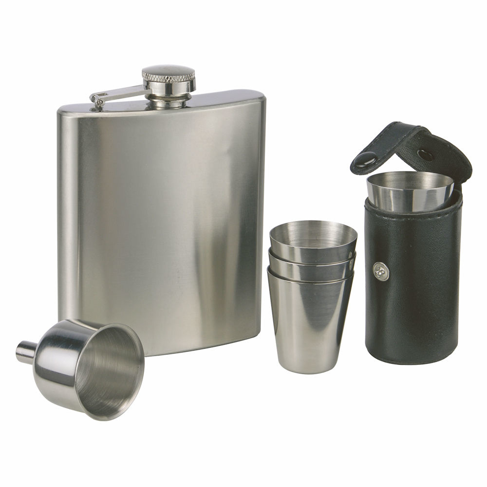 Voordelen van deze Decopatent 7 Delige Gift Set, Bestaande uit: RVS Heupfles, 4 Rvs Bekers, Pvc Lederen opbergtasje voor de bekers en Trechter
