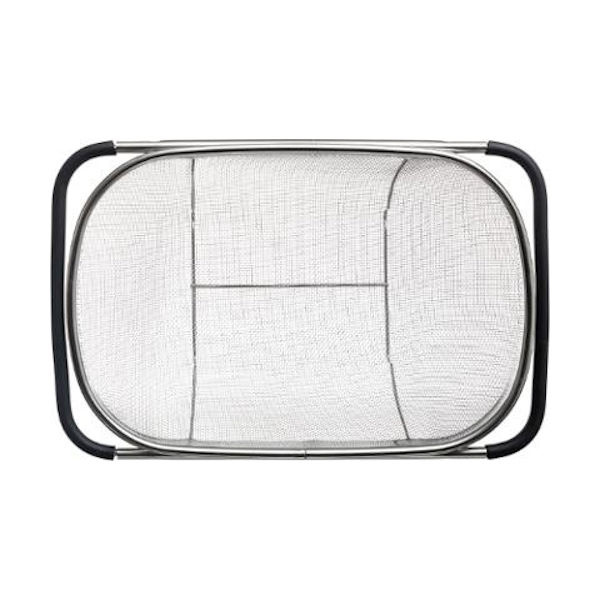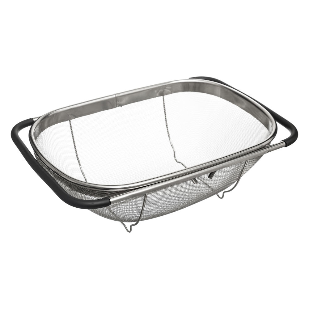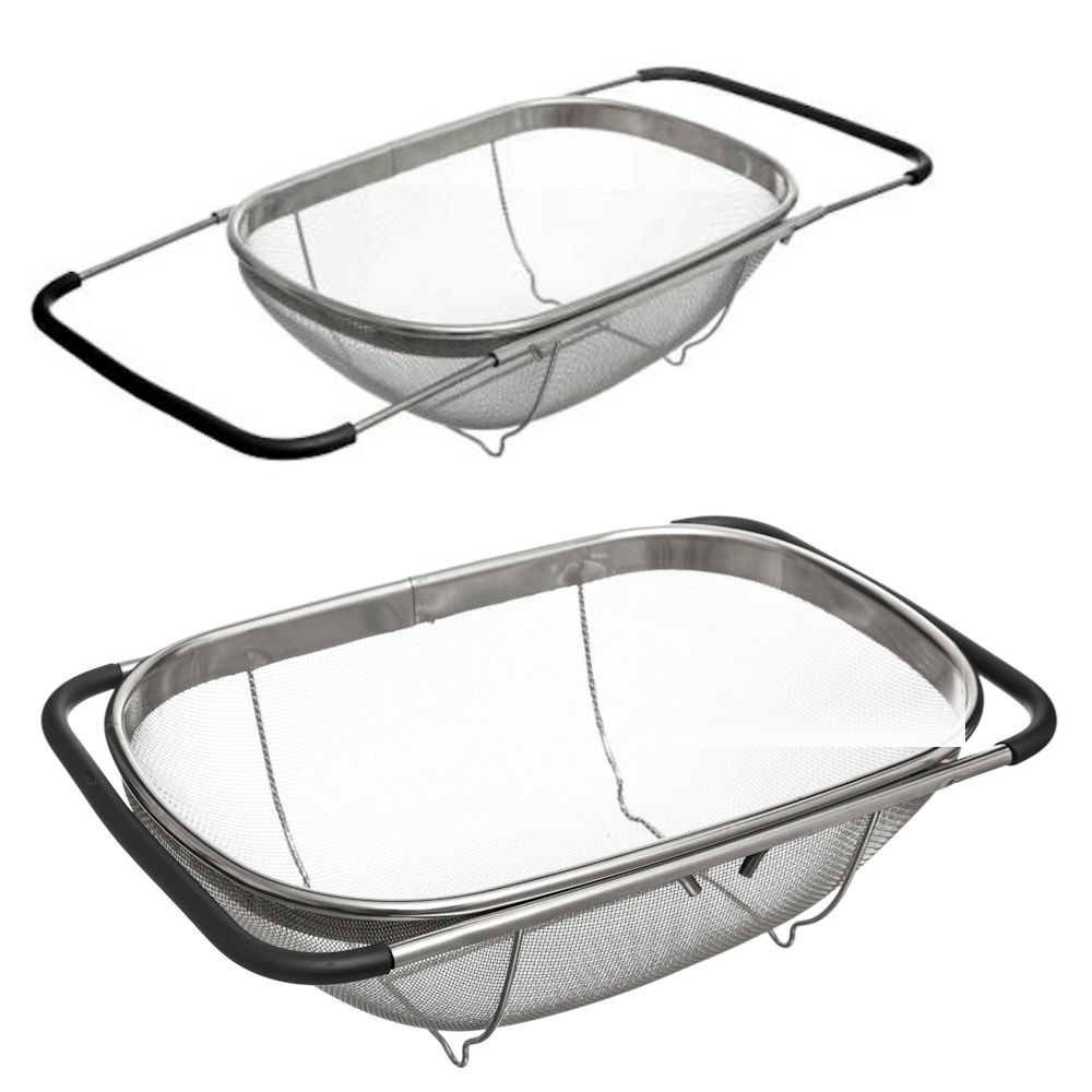 Een zeer handige keuken uitschuifbaar vergiet / zeef met aan de onderkant pootjes, waardoor deze zeef goed blijft staan als u uw eten erin afgiet. Door de uitschuifbare handvaten kunt u de zeef Groter of kleiner maken (Uitschuifbaar van 36,7 naar 54,5 Cm.) Hierdoor kun je deze zeef eenvoudig plaatsen om uw keuken wasbak, waardoor de onderkant vrij is. Wel zo handig bij het afgieten of zeven.
