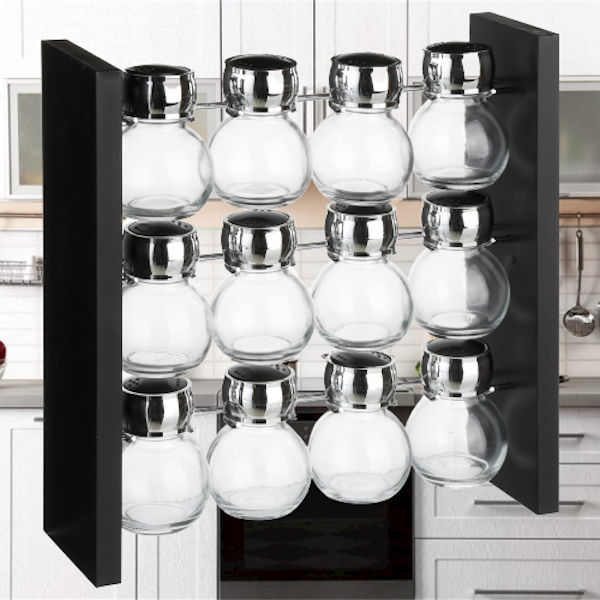 Het rek is erg praktisch en ruimtebesparend. Door dit rekje heb je al je kruiden georganiseerd bij elkaar staan. Dat bespaart je veel zoekwerk onder het koken. Het kruidenrek plaats je op het aanrecht in de buurt van de kookplaat.